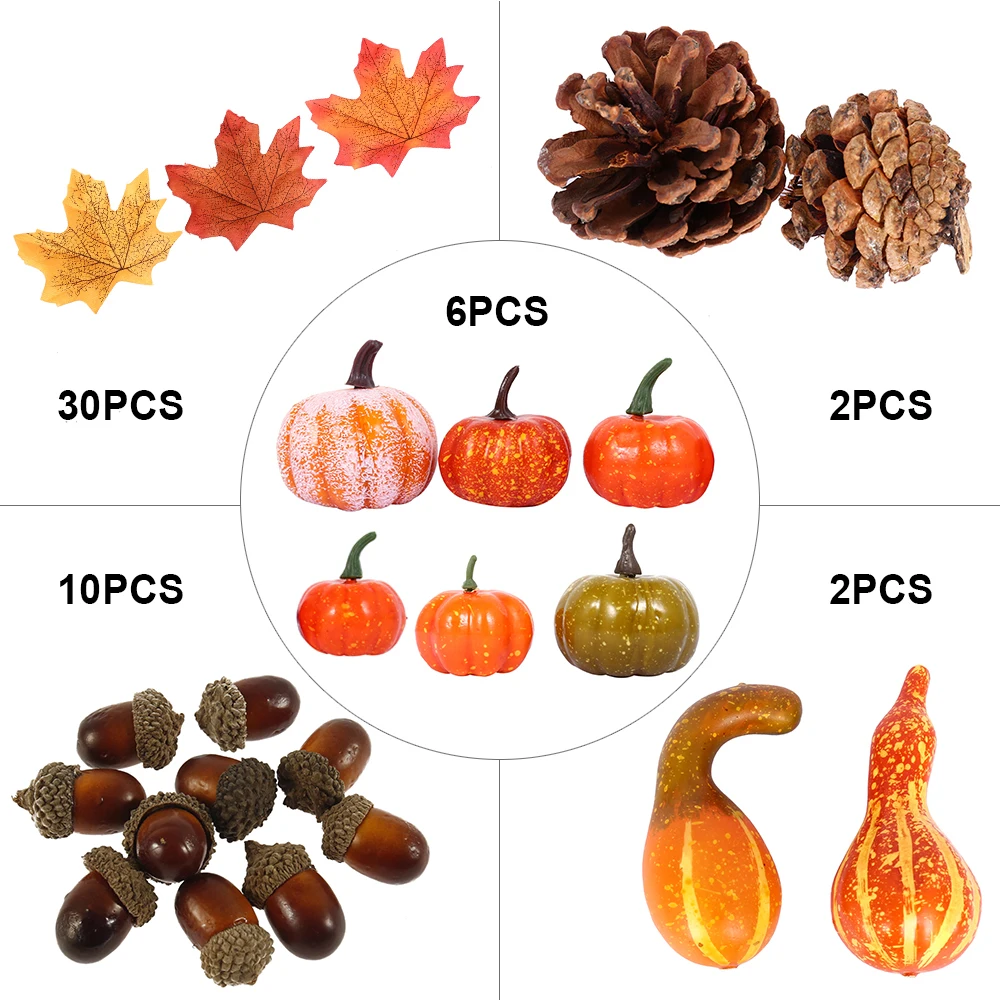 4. Безопасный материал: сосновые шишки натуральные и настоящие. Тыквы, тыквы и желуди сделаны из пены и выглядят очень визуально. Кленовые листья изготовлены из ткани и не гнили, не портятся и не пахнут из-за температурных изменений