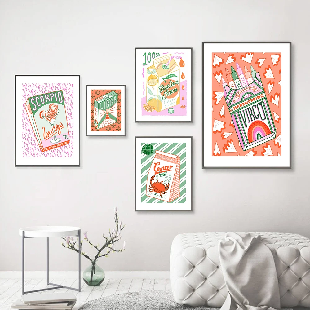 Мультяшный декор для кухни, постеры для напитков, творческий сок, слои рака, зодиака, весы, дева, холст, живопись, настенное искусство, печатные картины