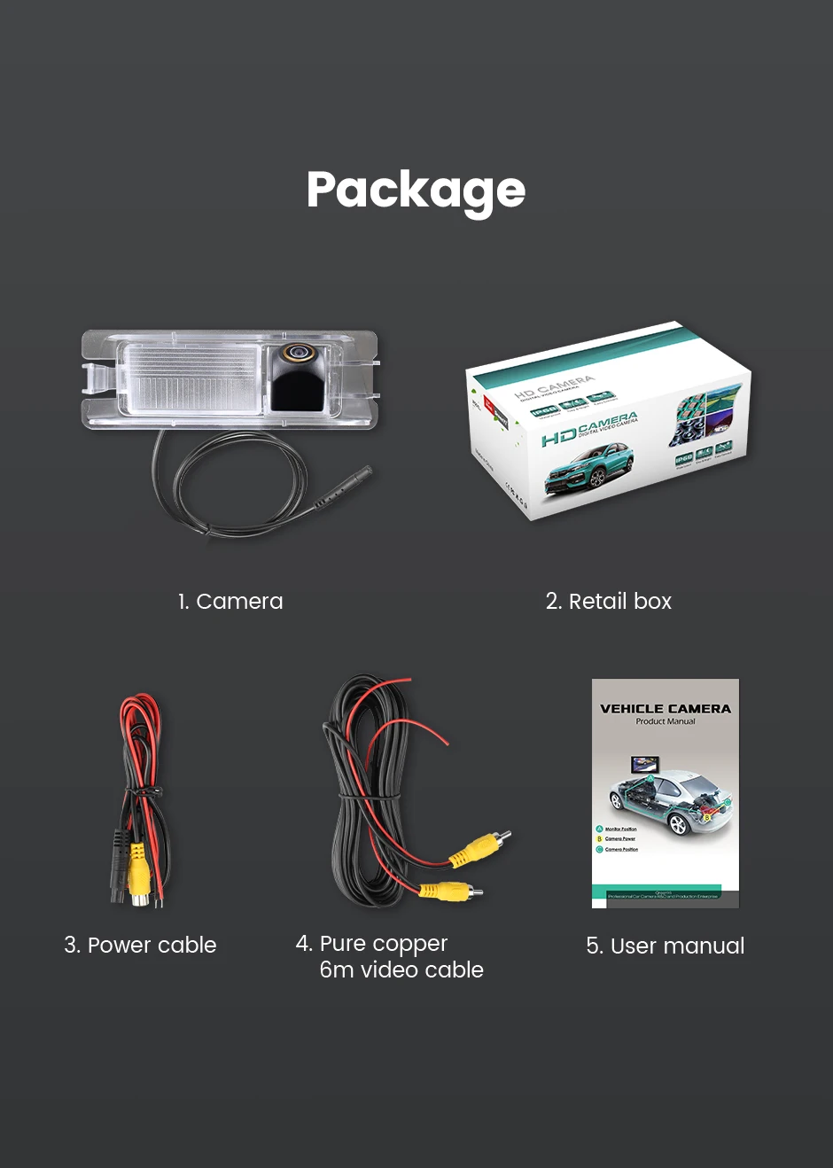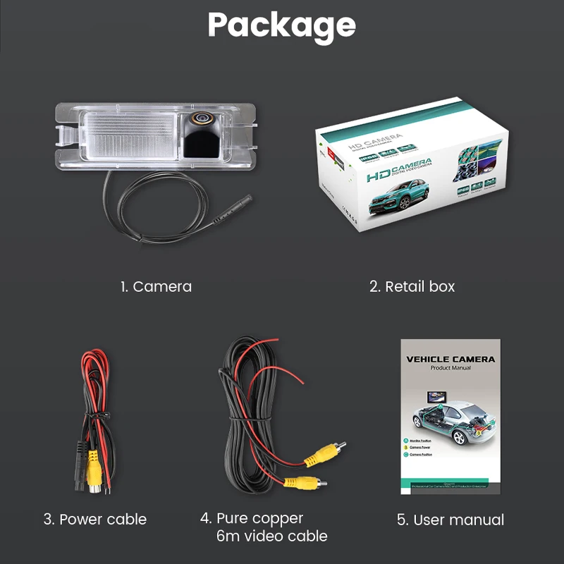 1. Камера заднего вида2. Розничная коробка3. Кабель питания4. Чистый медный 6 м видео кабель5. Руководство пользователя