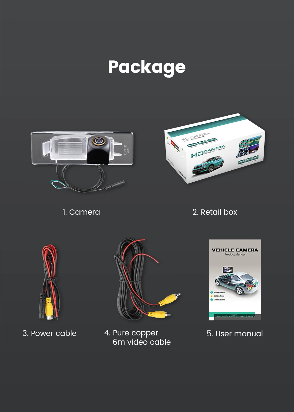 1. Камера заднего вида2. Розничная коробка3. Кабель питания4. Чистый медный 6 м видео кабель5. Руководство пользователя