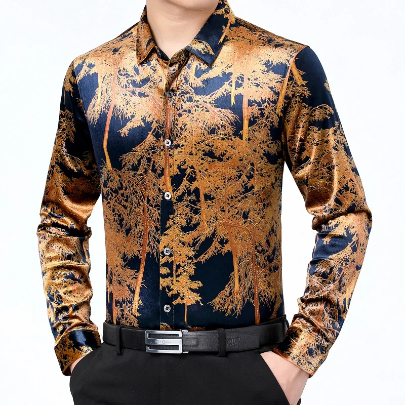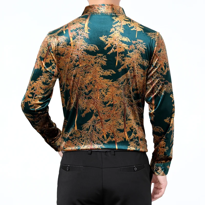 Роскошные велюровые мужские рубашки, брендовые рубашки с вышивкой золотых деревьев, мужские облегающие рубашки с длинным рукавом и пуговицами, мужские рубашки Camisa Social