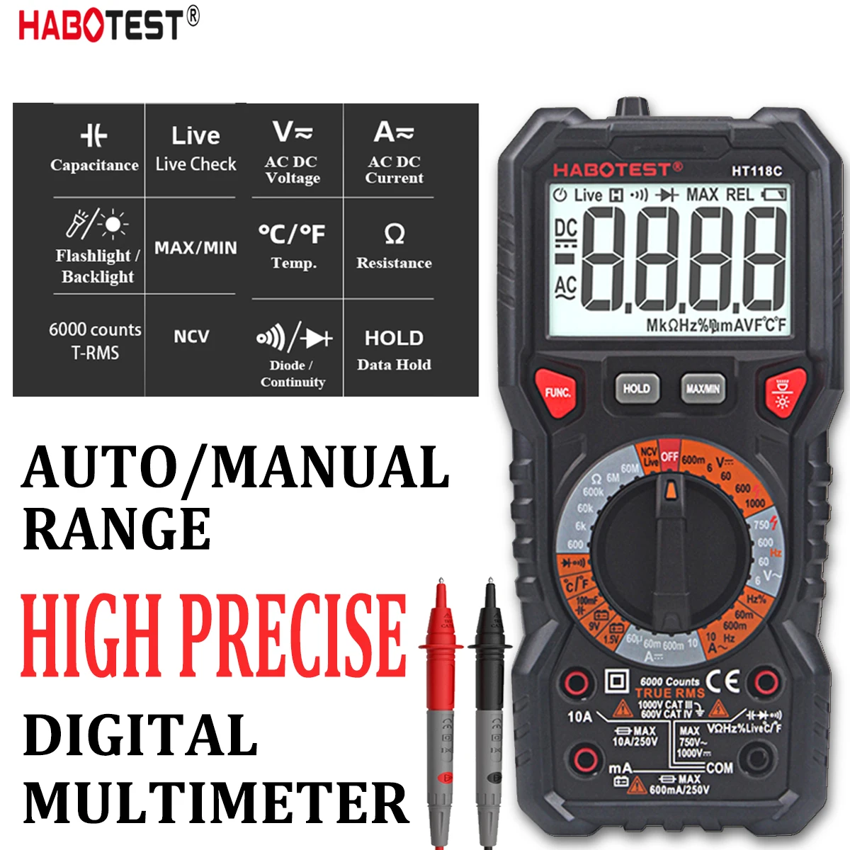 Высокоточный цифровой мультиметр HABOTEST HT118, 6000 отсчетов, 1000 В переменногопостоянного тока, Омметр, Гц, Бесконтактный индикатор напряжения