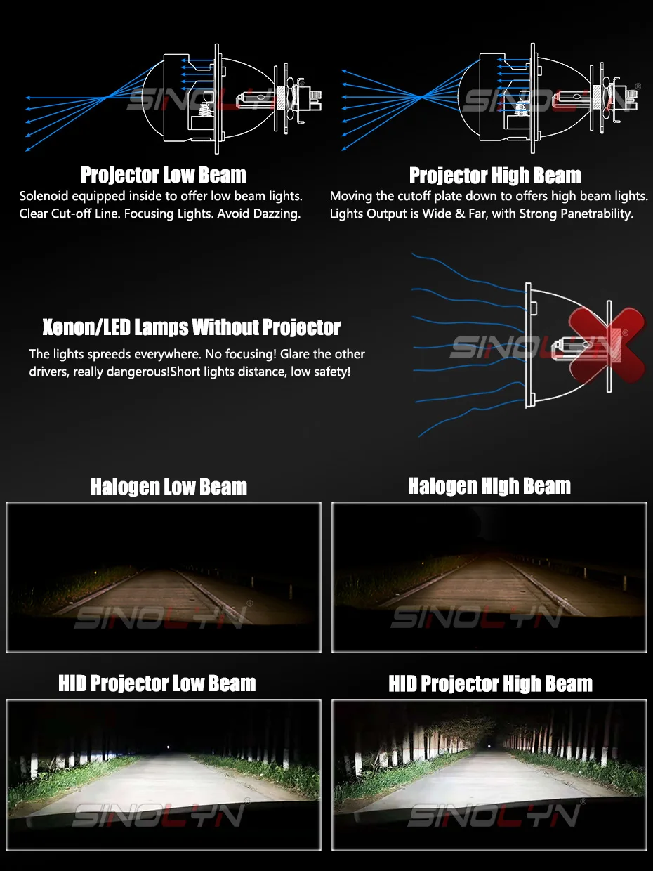 Преимущество:По сравнению с галогеном и светодиодный, HID гораздо ярче. И с линзой проектора, свет будет больше фокусироваться и с острым отключением линии. Подходит для использования при любых погодных условиях.