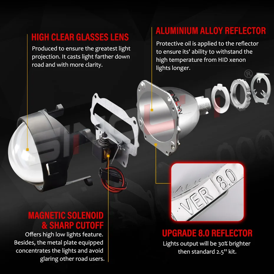 Соленоид:В обновленной версии 8,0 используется Сильный магнитный соленоид, который будет тянуть Дальний свет затвора на все пути, чтобы обеспечить больший выход на светильник при высоких балках. С более сильным соленоида мы разработали более глубокий высокий луч, который будет освещать дальше по дороге.