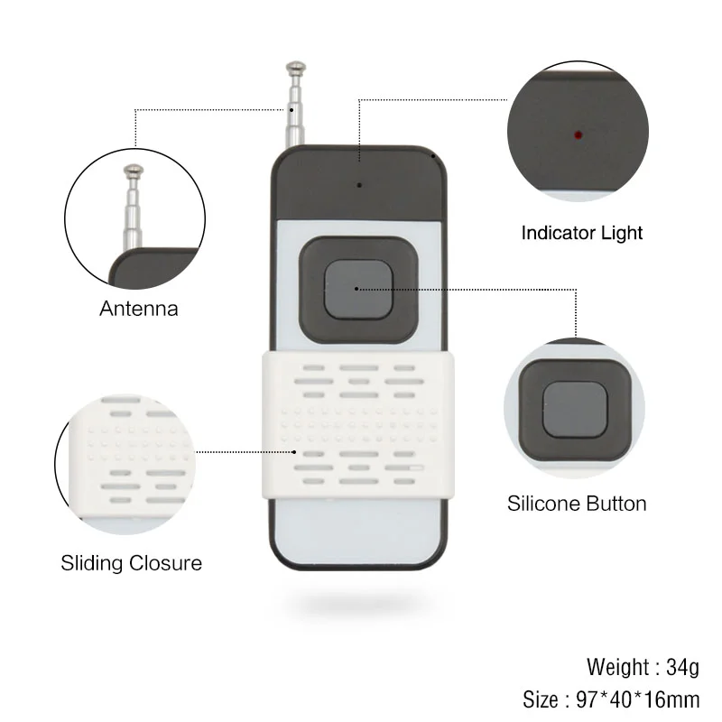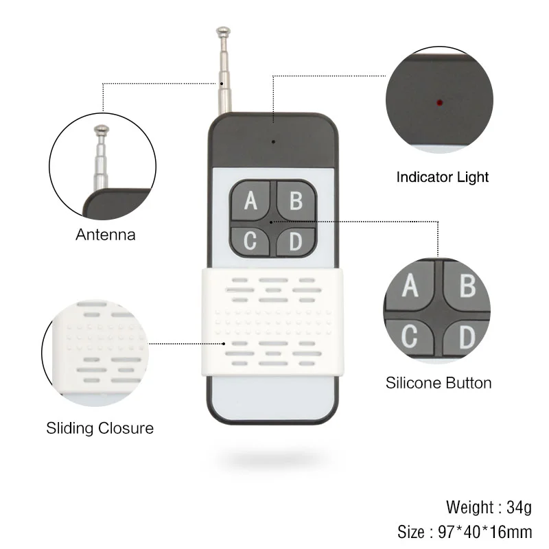 Область применения продукта Продукты могут быть использованы в домах, фермах, фабриках, офисах, лабораториях, супермаркетах и так далее. Гаражные ворота с дистанционным управлением \ электрические двери \ домашние двери \ двери затвора \ раздвижные двери \ ворота \ дорожные ворота Электрический занавес с дистанционным управлением \ водяной насос \ вентилятор \ лампа \ светодиодный светильник \ лампа \ вентиляционное устройство \ передача сигнала Мотор с дистанционным управлением положительное и отрицательное вращение переключатель двигателя сделай сам Если у вас есть какие-либо вопросы, пожалуйста, свяжитесь с нами. Посылка включает в себя Передатчик дистанционного управления (с батареей) Параметр 1 Рабочее напряжение: 12 В постоянного тока 2 Питание: один 23A 12V Батарея 3 рабочий ток: ≤ 10 мА 4 мощность излучения: ≤ 10 мВт 5 синхронизации резистора: 4,7 м 6 режимов модуляции: ASK (амплитудная модуляция) 7 Рабочая частота: 433 МГц 8 дальность передачи: 1000 м (это Теоретическое расстояние на открытом поле) 9 тип кодировщика: код обучения 1527