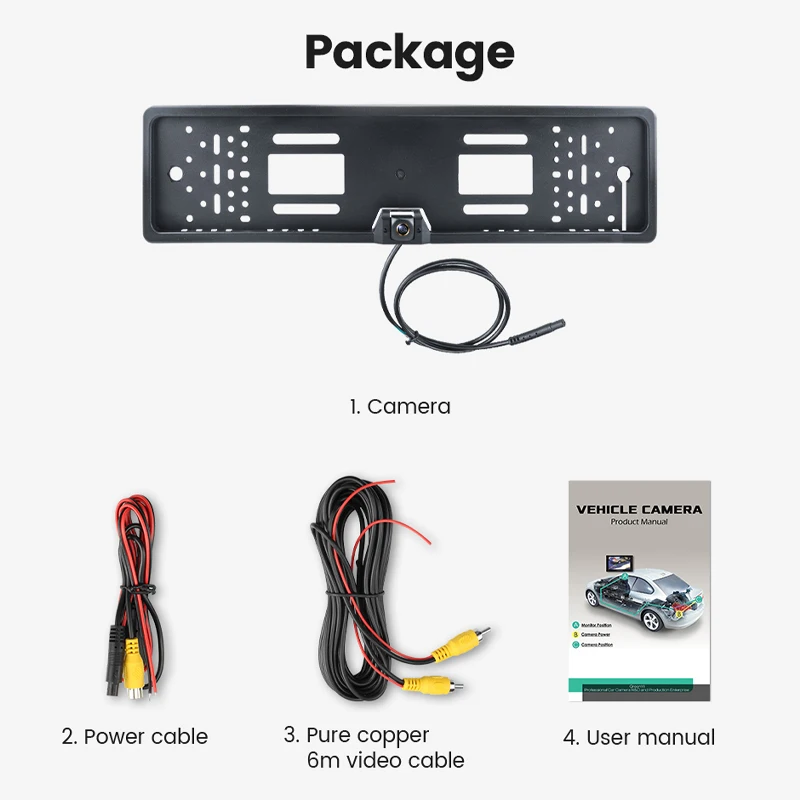 1. Камера заднего вида2. Розничная коробка3. Кабель питания4. Чистый медный 6 м видео кабель5. Руководство пользователя