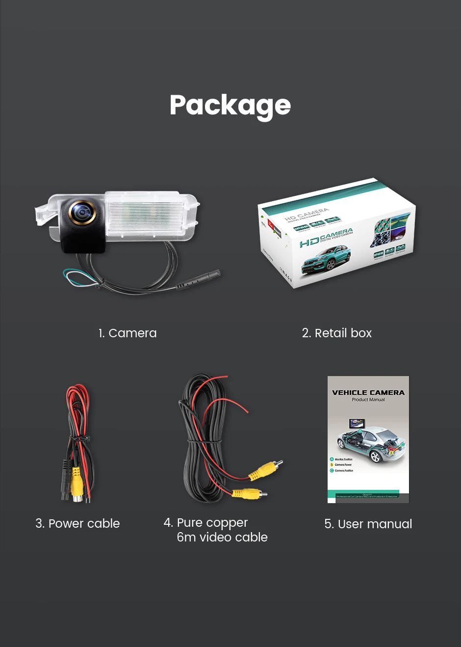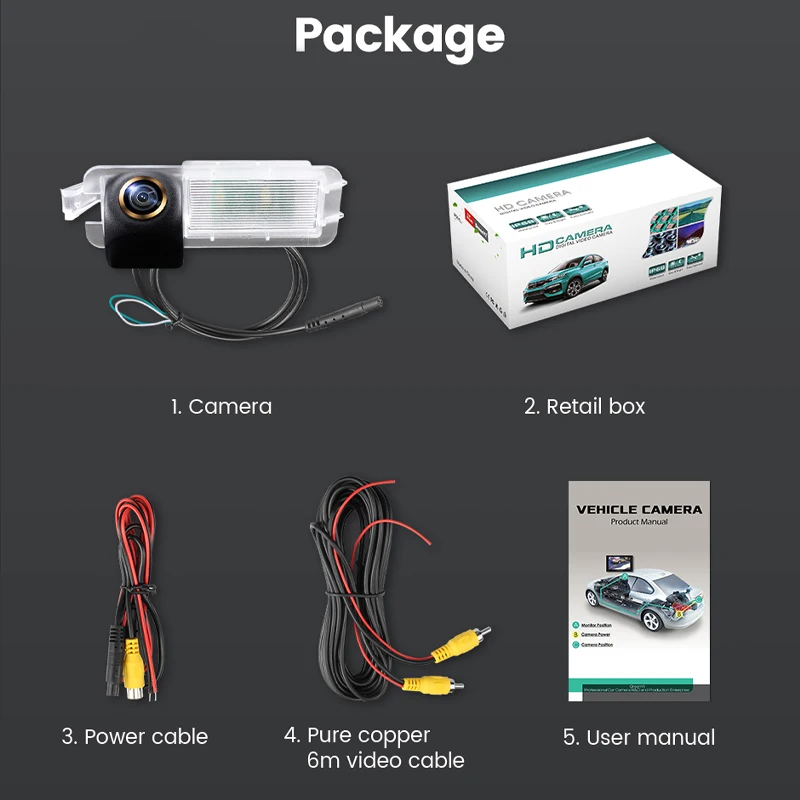 1. Камера заднего вида2. Розничная коробка3. Кабель питания4. Чистый медный 6 м видео кабель5. Руководство пользователя