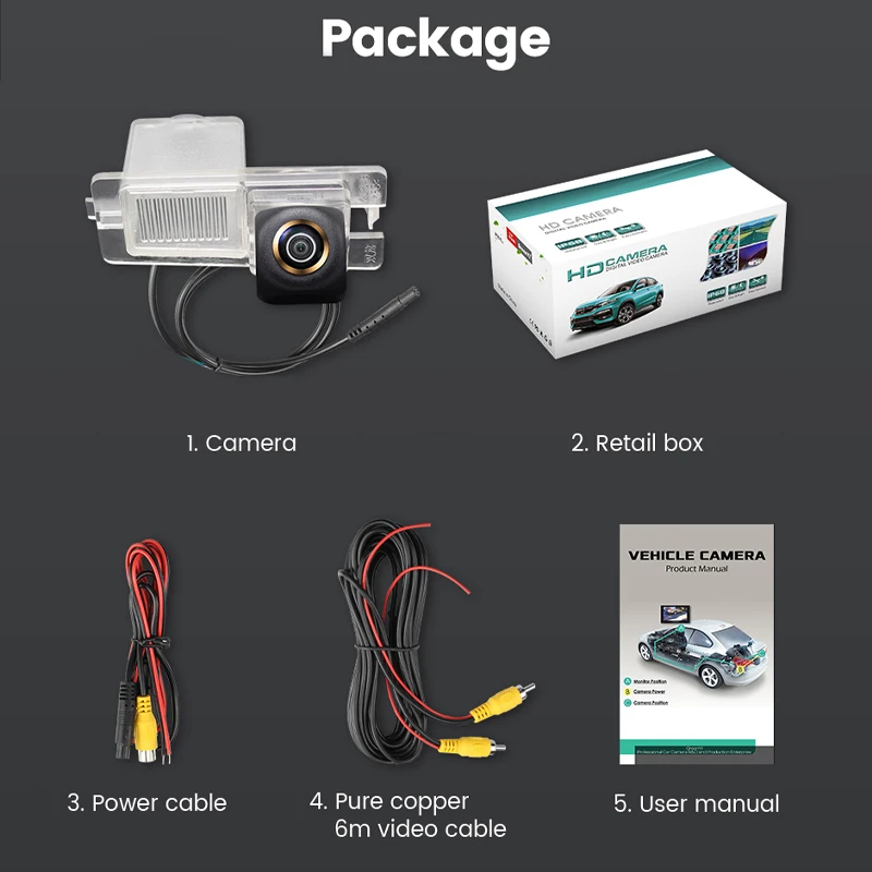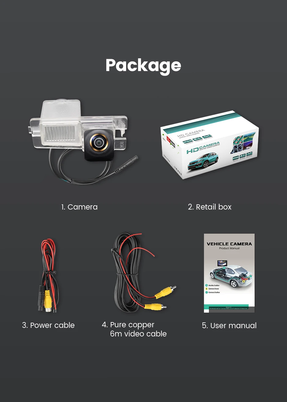 1. Камера заднего вида2. Розничная коробка3. Кабель питания4. Видеокабель из чистой меди 6 м5. Руководство пользователя