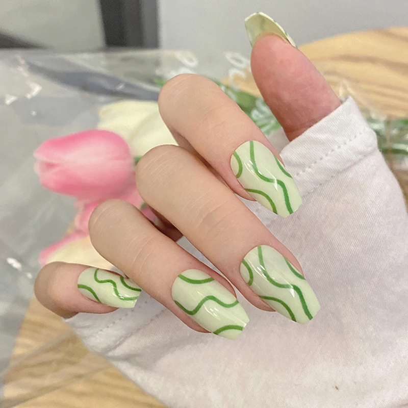 Летние зеленые волнистые накладные ногти полное покрытие накладные ...