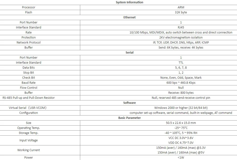 ????DHCP & DNS, автоматическое получение ip-адреса и ip-адреса запроса через протокол последовательной настройки????Установите параметры через веб-страницу и серийный по команде????Обновление прошивки через сеть????Авто-Auto MDI/MDIX, RJ45 порт с 10/100 Мбит/с????Скорость передачи данных последовательного порта от 600 бит/с до 460,8 кбит/с, проверка бит без, нечетный, ровный, отметка и место????Режим работы: TCP сервер, TCP клиент, UDP клиент, UDP сервер, httpsD клиент????Поддержка виртуального последовательного порта и предоставление соответствующего программного обеспечения USR-VCOM????Посылка сердцебиения механизм для обеспечения надежного соединения, положить конец мертвой связи????Используйте r-defined механизм регистрации посылка, проверьте состояние подключения и используйте в качестве пользовательского заголовка пакета????В режиме TCP сервера, клиентский номер колеблется от 1 до 16; По умолчанию номер 4????Глобальный Уникальный MAC адрес, купленный у IEEE, пользователь может определить MAC адрес????По умолчанию восстановите фабрику????Через шлюз, переключатели, роутеры????Может работать в локальной сети, также может работать в Интернете (внешняя сеть)