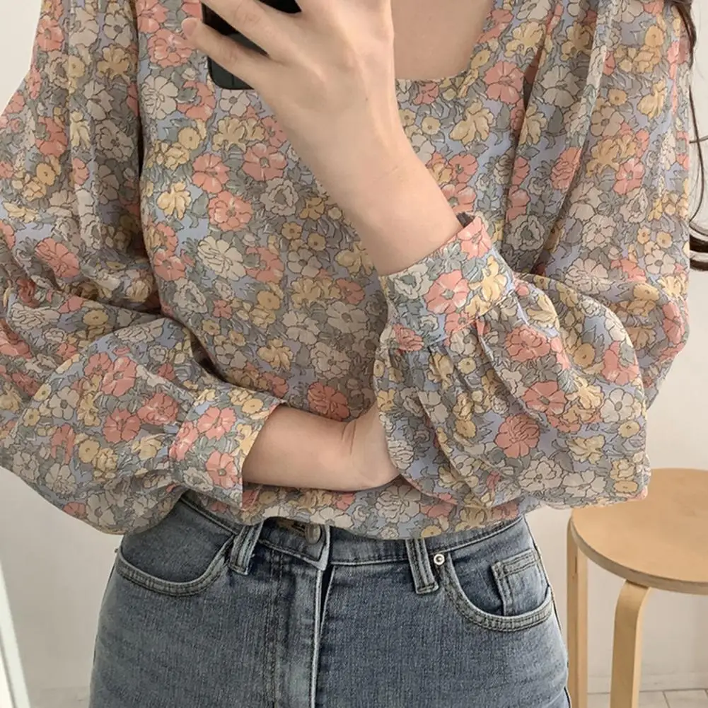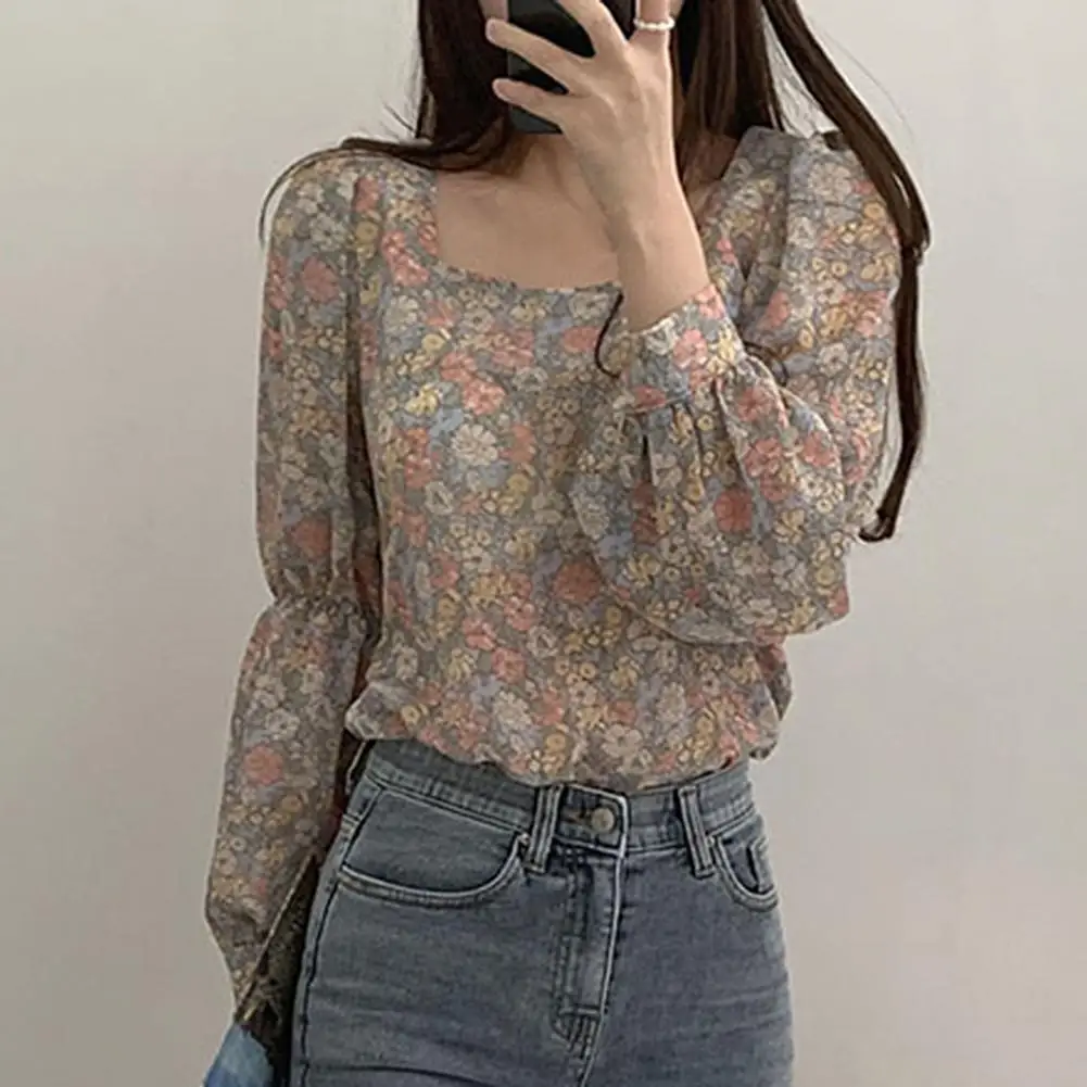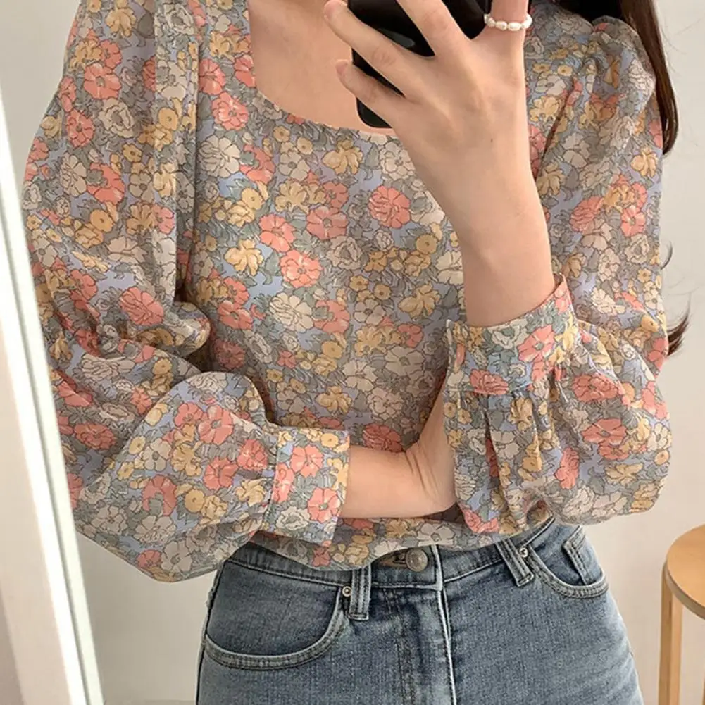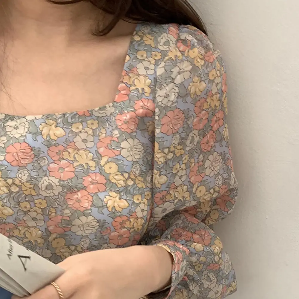 Блузка женская с цветочным принтом, квадратным вырезом и пышными рукавами