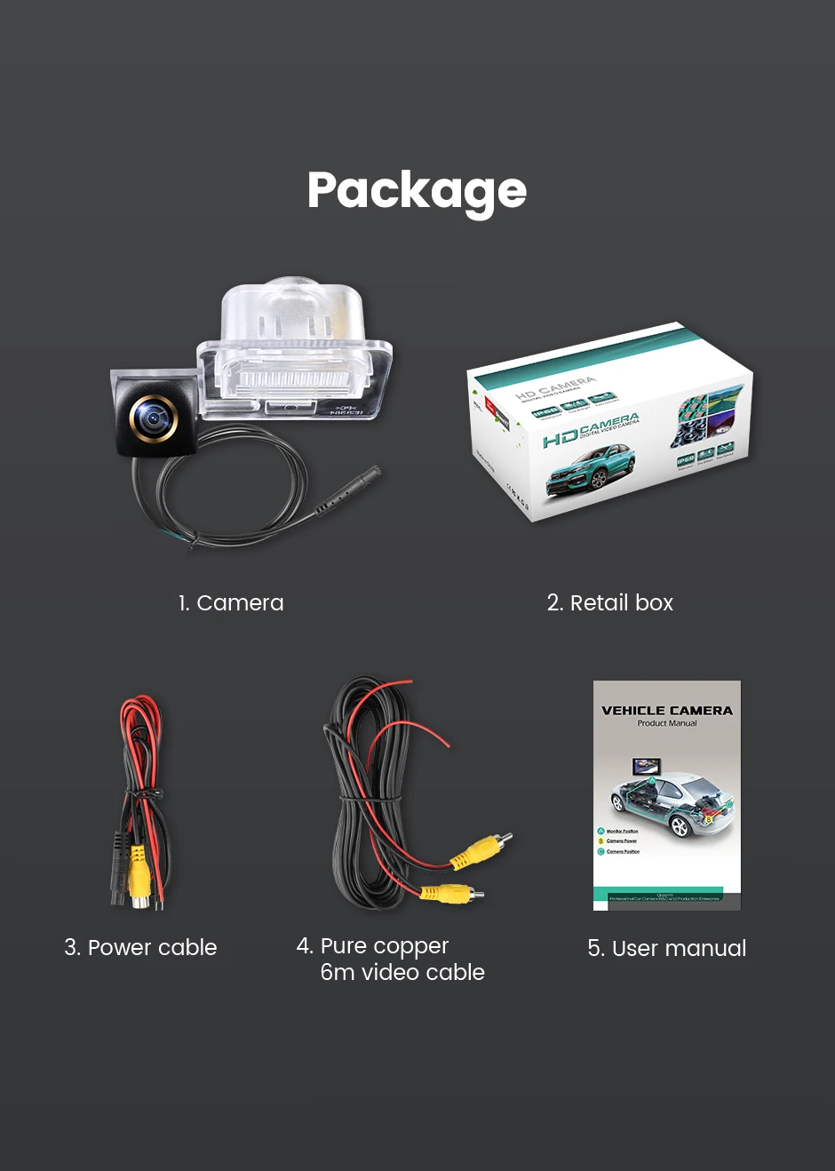 1. Камера заднего вида2. Розничная коробка3. Кабель питания4. Видеокабель из чистой меди 6 м5. Руководство пользователя