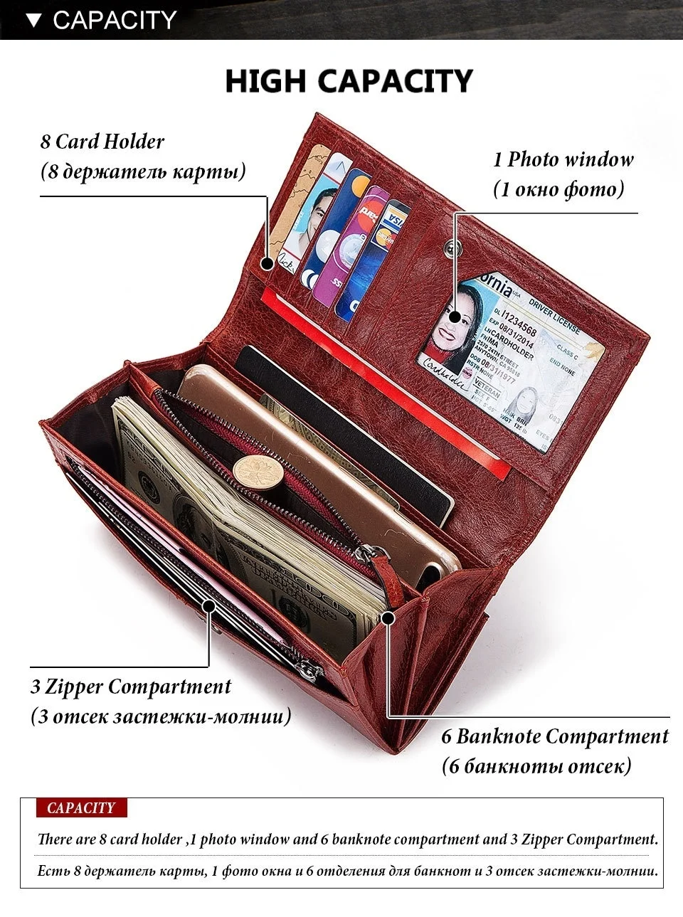 Новинка 2021, женский модный кожаный кошелек, Длинный кошелек из воловьей кожи с несколькими карманами для карт, вместительный клатч с защитой от кражи, кошелек для дам
