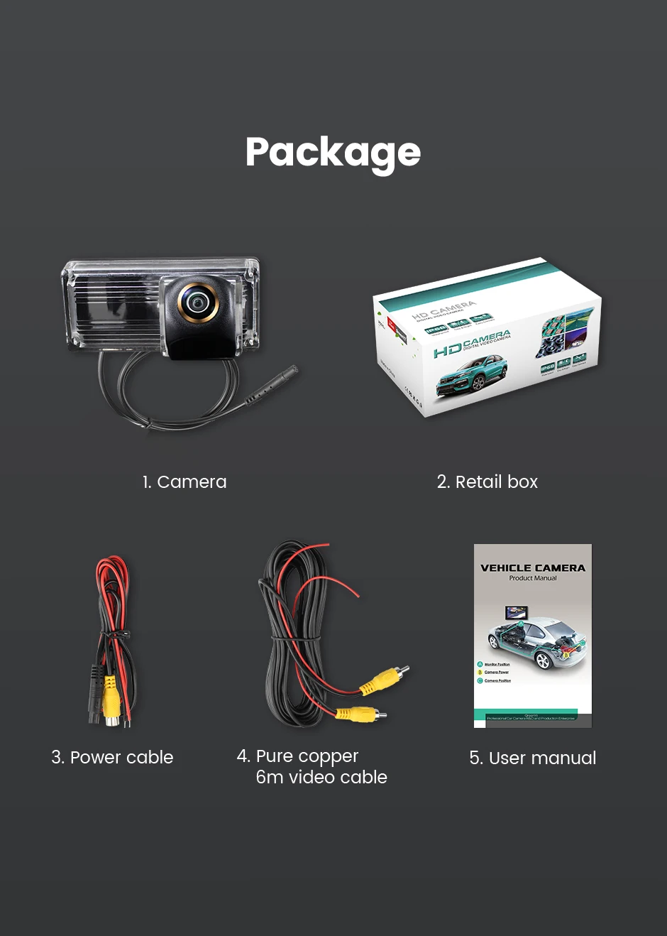 1. Камера заднего вида2. Розничная коробка3. Кабель питания4. Чистый медный 6 м видео кабель5. Руководство пользователя