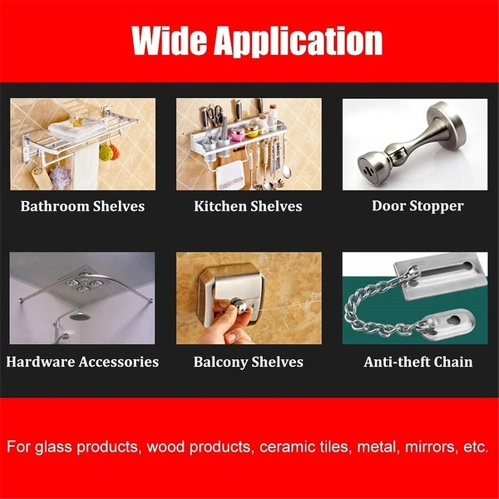 1. Не нужно сверлить, избегайте шума и сохраняйте красивую поверхность.2. Сильная Липкость, не упадет и не повредит стену.3. Здоровый, экологически чистый, чистый, прочный.4. Легко использовать, просто и удобно.5. Подходит для керамической плитки, мрамора, поверхности из массива дерева, влажной поверхности и т. д.Список деталей:1 х герметичный клей