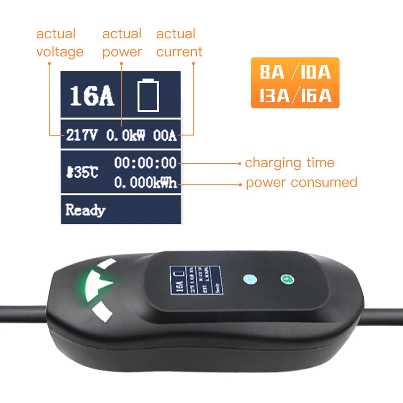 Зеленая кнопка предназначена для задержки зарядки. Синяя кнопка предназначена для регулировки тока. Нажмите синюю кнопку, чтобы изменить ток. При регулировке тока Вилка питания всегда подключается, вилка типа 1 SAE J1772 (или типа 2) отключается. Когда вы достигнете нужного тока, подключите его и начните зарядку.