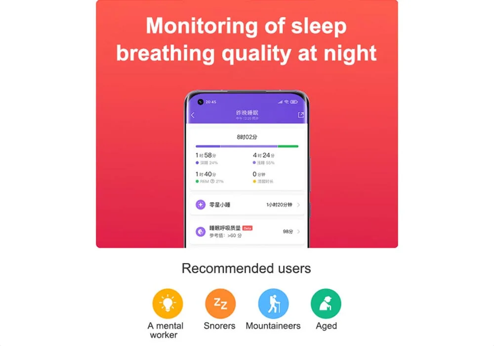Контроль качества ночного сна и дыхания через непрерывный мониторинг изменений кислорода в крови, анализ дыхания во время сна, обеспечивает качество сна, чтобы вы могли спать более спокойно.