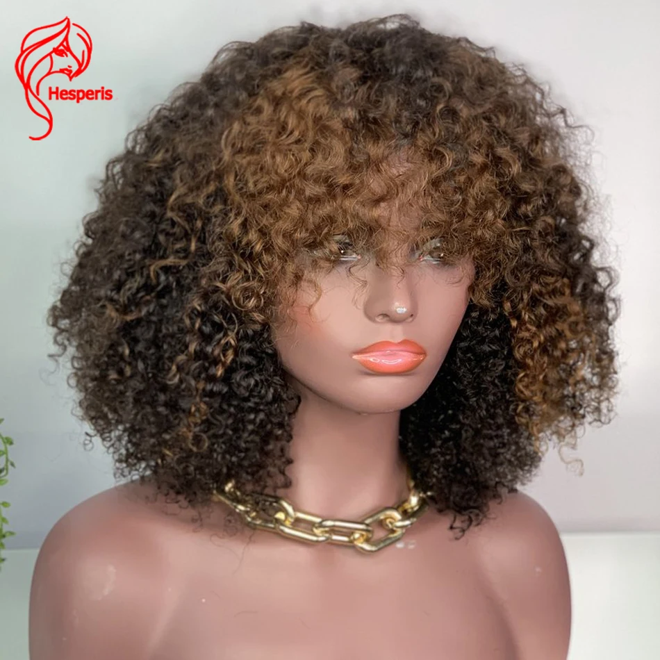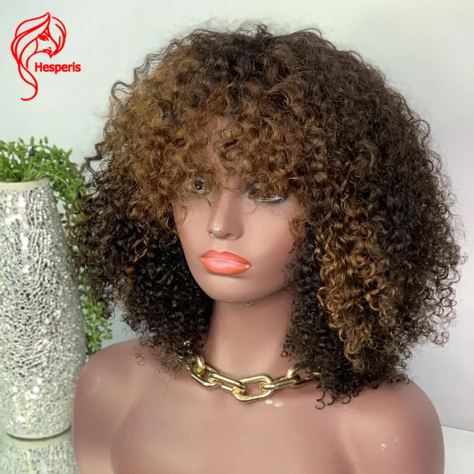 Hesperis 200 плотность короткий Боб вьющиеся человеческие волосы парики с челкой бразильская кудрявая кожа головы полностью машинная работа парик