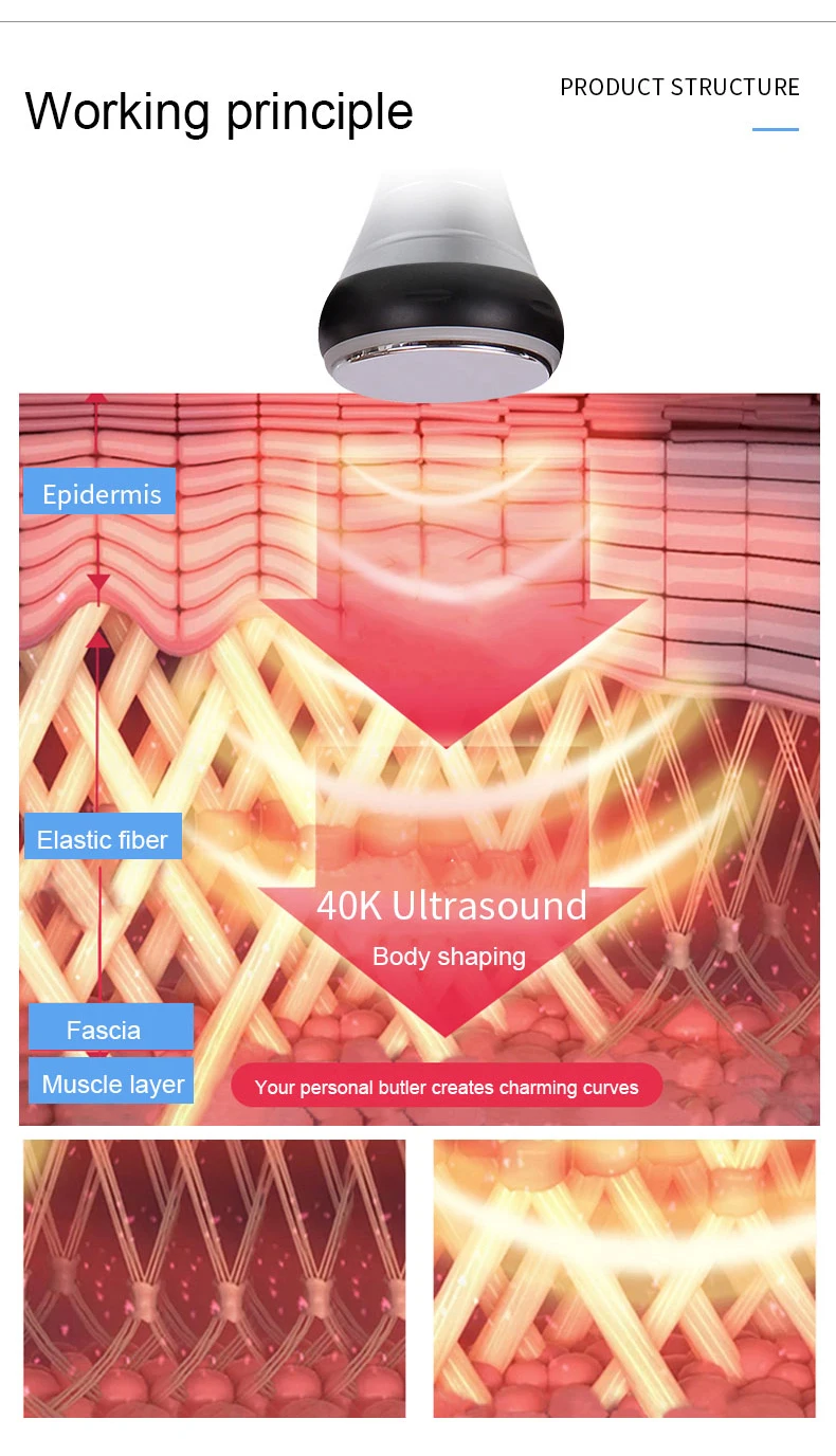 Лазер проникает в слой жира от адипоцитов (жировых клеток), попадает в интерстициальную ткань и устраняется естественным образом организмом. Сеанс лечения длится 10 минут в каждой зоне и рекомендует Еженедельный сеанс в течение 8-10 недель. Липолозер описывается как липолиз с лазерной помощью (пробой хранимых жиров в жировых клетках) или нехирургическое липосакция. Можно использовать на талии, животе (средней и нижней), спине (верхней, средней, нижней), ягодицах, бедрах, руках и подмышках.Многополярная RF технология может нагревать кожу и подкожный жировой слой, в то же время сокращает коллаген, волокна и стимулирует регенерацию коллагена, таким образом, она может достичь лучшего эффекта подтяжки кожи, удаления морщин, уменьшение жира и Контурирование тела.С сочетанием техники вакуумного отрицательного давления RF и Vortex, чтобы генерировать сильную биотепловую энергию высокочастотным током через ретикулярный тип петли. Таким образом, он может увеличить температуру внутри и сломать глубокие жировые ткани в организме, которые могут сделать коллаген регенерировать и рекомбинировать, для достижения эффекта затягивания кожи.С общей сильной звуковой волновой головкой, сильная звуковая волна 40 кГц может быть испускана человеческому телу для воздействия жировых клеток яростно и вызывая трение между жировыми клетками. Это может привести к эффективному потреблению калорий и влаги в жировых клетках и уменьшить размер жировых клеток. Более того, вибрация звуковых волн может вызвать ожесточенное воздействие жировых клеток, чтобы они мгновенно взорвались, уменьшили количество жировых клеток и тем самым достигли эффекта удаления жира.
