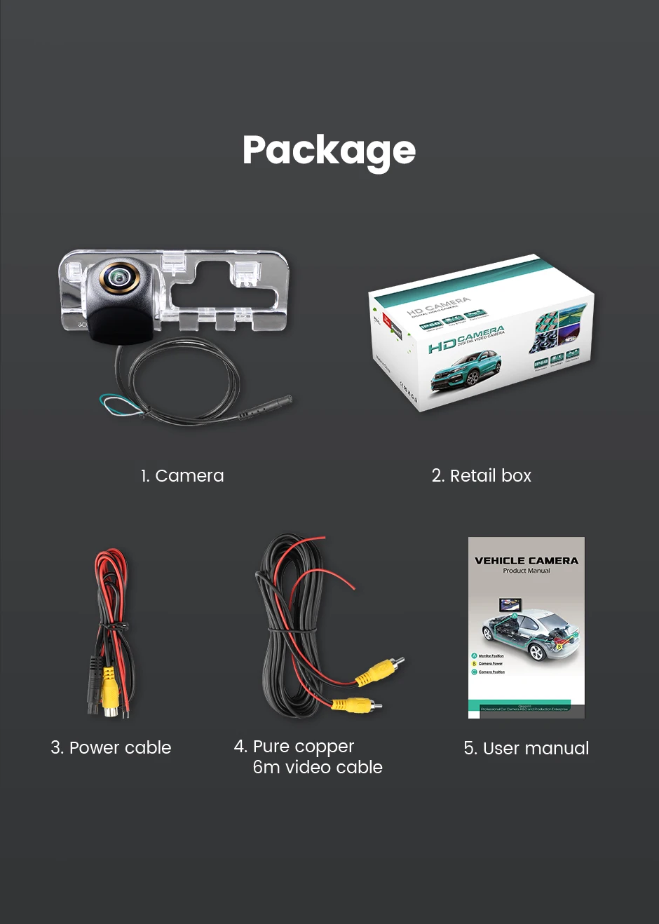 1. Камера заднего вида2. Розничная коробка3. Кабель питания4. Чистый медный 6 м видео кабель5. Руководство пользователя