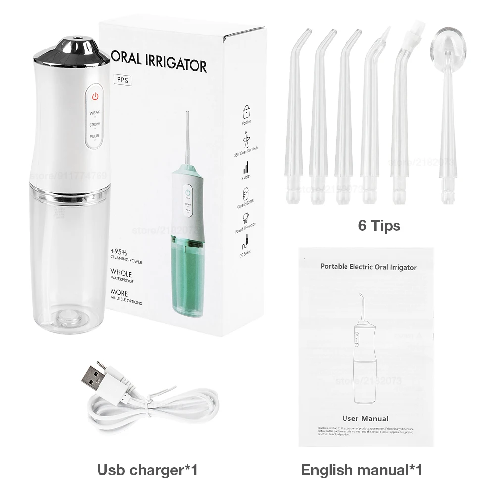 Особенности:Материал корпуса: АБС-пластикВодонепроницаемость: IPX7 водонепроницаемыйНапряжение питания: 5 В/1 АИнтерфейс зарядки: USBЕмкость аккумулятора: 800 мА литиевая батареяВремя зарядки: 5 часовЕмкость резервуара для воды: 220 млВыносливость: 30 днейРежим работы: 3 режимаОдин брутто/Вес нетто: 0,27/0,185 кгРазмер изделия: 22*5,8*5,8 смОбновленный белый/розовый/зеленыйУстройство * 1Коробка * 1USB зарядка * 1Наконечник * 6Руководство на английском языке * 1