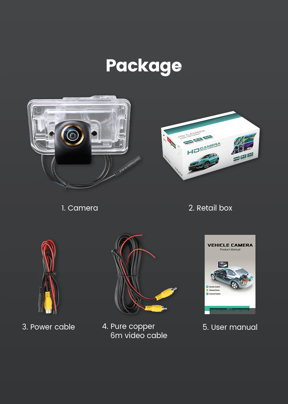 1. Камера заднего вида2. Розничная коробка3. Кабель питания4. Чистый медный 6 м видео кабель5. Руководство пользователя