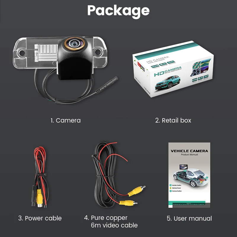 1. Камера заднего вида2. Розничная коробка3. Кабель питания4. Чистый медный 6 м видео кабель5. Руководство пользователя
