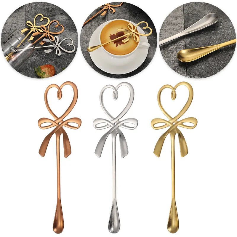 Кофейная ложка из нержавеющей стали с 3D бантом, в форме сердца, золотые, серебристые, розовые, золотые чайные десертные ложки, кухонная посуда
