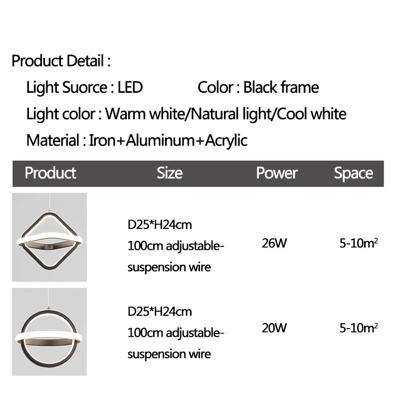 1. Название: современный светодиодный подвесной светильник2. Цвет корпуса: черная оправа3. Размер: d25 см, мощность: 26 Вт, площадь: 5-10 м2D25 см, мощность: 20 Вт, площадь: 5-10 м24. Материал: металлический корпус лампы, абажур из ПВХ5. Применение: гостиная, спальня, столовая, кухня6. Стиль: простой светодиодный подвесной светильник7. Тип: современные домашние осветительные приборы8. Доставка из Китая9. Гарантия: один год10. Вход: AC 110V 220V