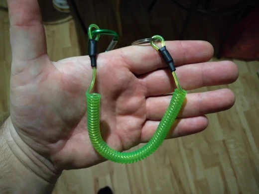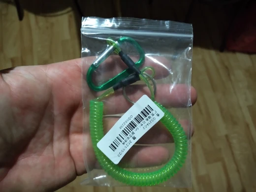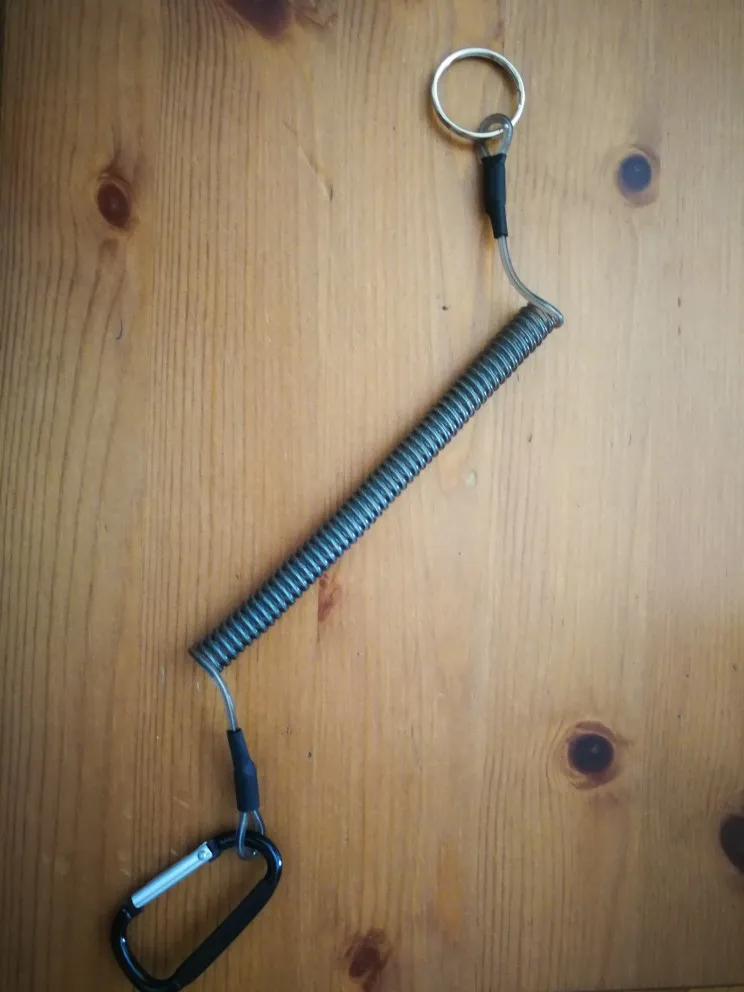 Стальной трос - это громко сказано. Полимерный шнурок, усиленный 1мм железным канатиком. Брал как страховочный шнурок для шуруповерта. Закрепил за кобуру. Должен выдержать если выпадет из рук на высоте.