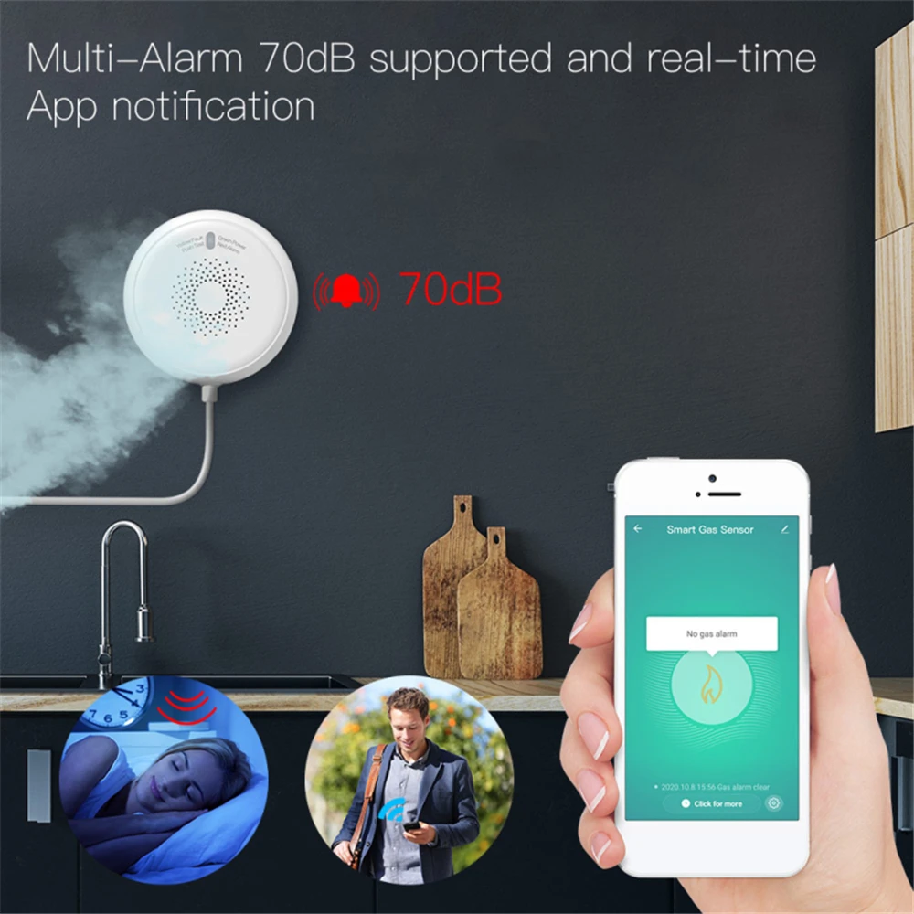 1 [Обнаружение двойного датчика в реальном времени]: Эта wifi сигнализация на природном газе имеет встроенный высокопроизводительный компьютерный чип, который может почувствовать окружающий воздух в первый раз, 3S Быстрый отклик, и высокая чувствительность. Подходит для обнаружения сжиженного газа (метана), природного газа, угольного газа, газового топлива, искусственного газа, сжиженного нефтяного газа, сжиженного природного газа и т. д., высокочувствительный датчик температуры, точная передача информации о тревоге.