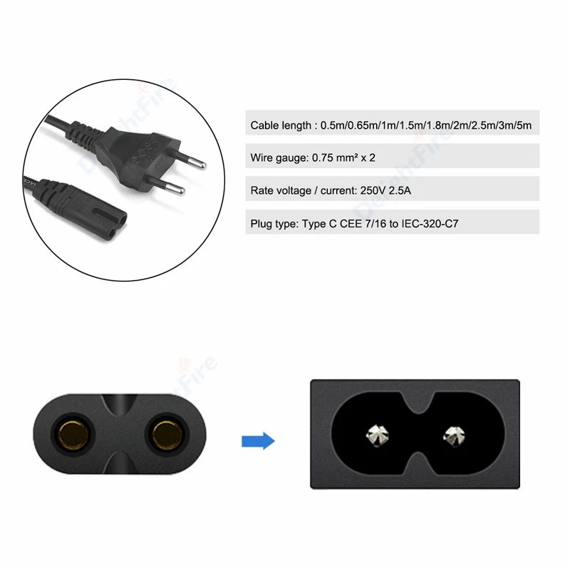 100% новый кабель питания с вилкой европейского стандарта 8 IEC320 C7 Проволочный Калибр: 0,75 мм² x 2 Напряжение/ток: 250 В 2.5A Материал проводника: медь Изоляционный материал: ПВХ Тип наконечника: штепсельная вилка европейского стандарта типа C Тип торца: IEC-320-C7 Длина кабеля (приблизительно): 1,5 мПосылка включает в себя: