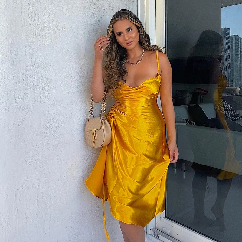 Платье-комбинация HOUZHOU женское атласное, пикантный желтый сарафа...