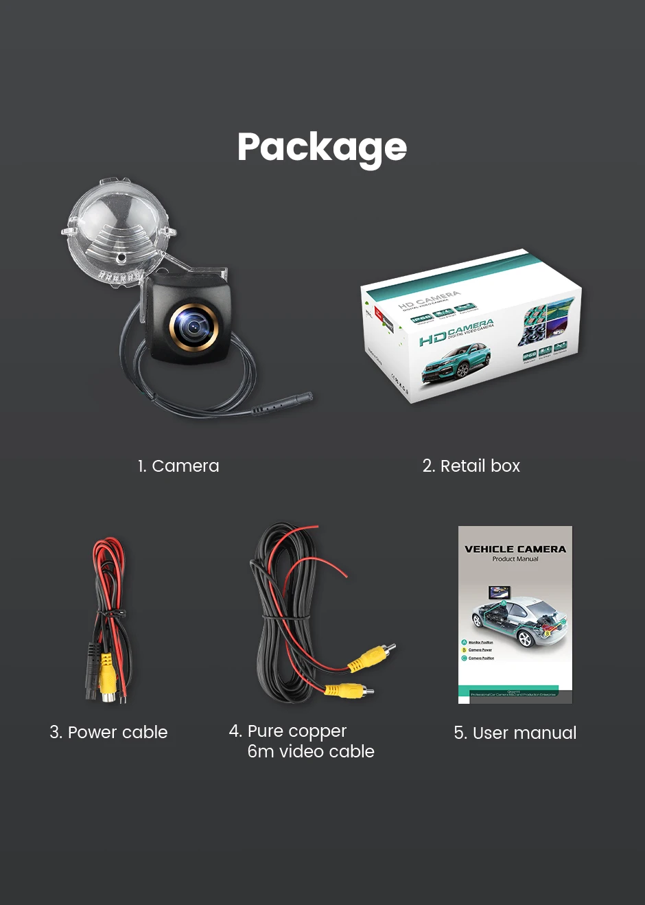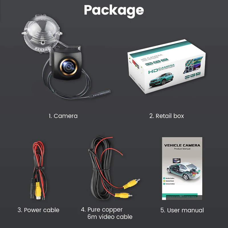 1. Камера заднего вида2. Розничная коробка3. Кабель питания4. Видеокабель из чистой меди 6 м5. Руководство пользователя