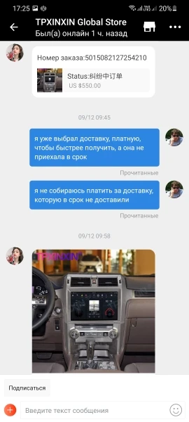 Заказал у данного продавца монитор на Лексус gx 460 была доставка до 2-го декабря, меня убедили что придет вовремя, В итоге 26 декабря открыл спор,чтобы вернули деньги,они обманули меня,и мне дали ложный трек номер,чтобы мог отследить,типа чтобы не переживал, а сами отправили товар лишь 2 декабря, под другим трек номером, когда открыл спор и они проиграли,начали хамить,начали писать на ватцап,с не хорошими словами, фото приложу, в общем что я хочу сказать,категорически не советую