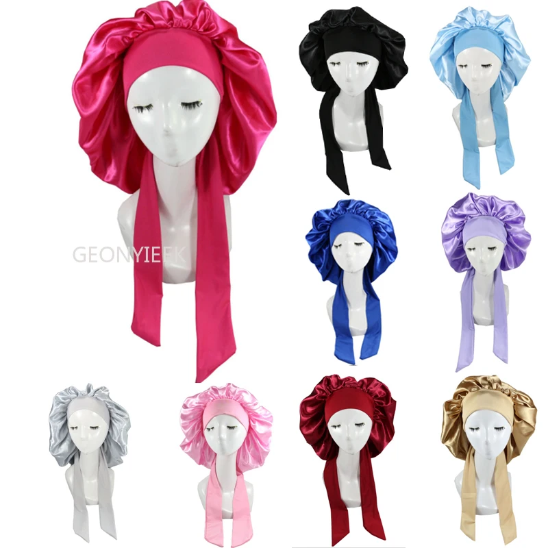 GEONYIEEKПриятный для кожи атлас обеспечивает более воздухопроницаемость и эластичность, Длинная атласная шапочка подходит для большинства размеров головы, эластичная широкая лента обеспечивает плотное прилегание, не оставляет следов и не скользит.