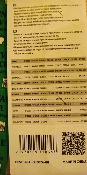 Тип батареи: батарея CR2032 3V литиевая Кнопка батарея SB-T15 BR2032Бренд: CUNVAEХимия: батарея LiMnO2Номинальное напряжение: 3 вКритическое напряжение: 2,0 VНормальная емкость: 220 мАчСтандартный ток: 0,4 мА-чНепрерывный ток: 3 мА (максимум)Импульсный ток: 30 мА (максимум)Максимальный размер: 20,0x3,2 ммТемпература: от-40 до + 60 градусов ЦельсияРазмеры: 2 см x 2 см-0,79 дюйма x 0,79 дюймаТакже может быть известен как: BR2032, CR2332, BR2332, DL2032, SB-T15, 2032, EA2032C, ECR2032, L14, L2032, LF1/2V CR2032 CR 2032Применение: часы, часы, калькулятор, фонари, лазерные ручки, пульты дистанционного управления, игрушки, электронные потребительские товары...