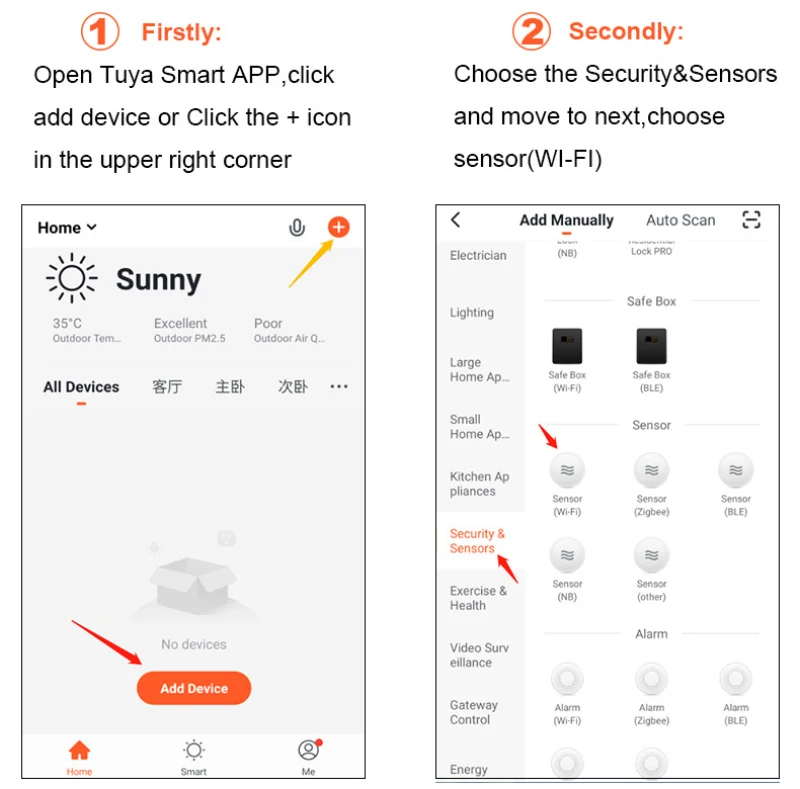 При обнаружении дыма и пожаров, звуковой сигнал до 85 дБ будет выдан с красным миганием светодиодный светильник и отправлен в мобильное приложение для защиты безопасности всей семьи.