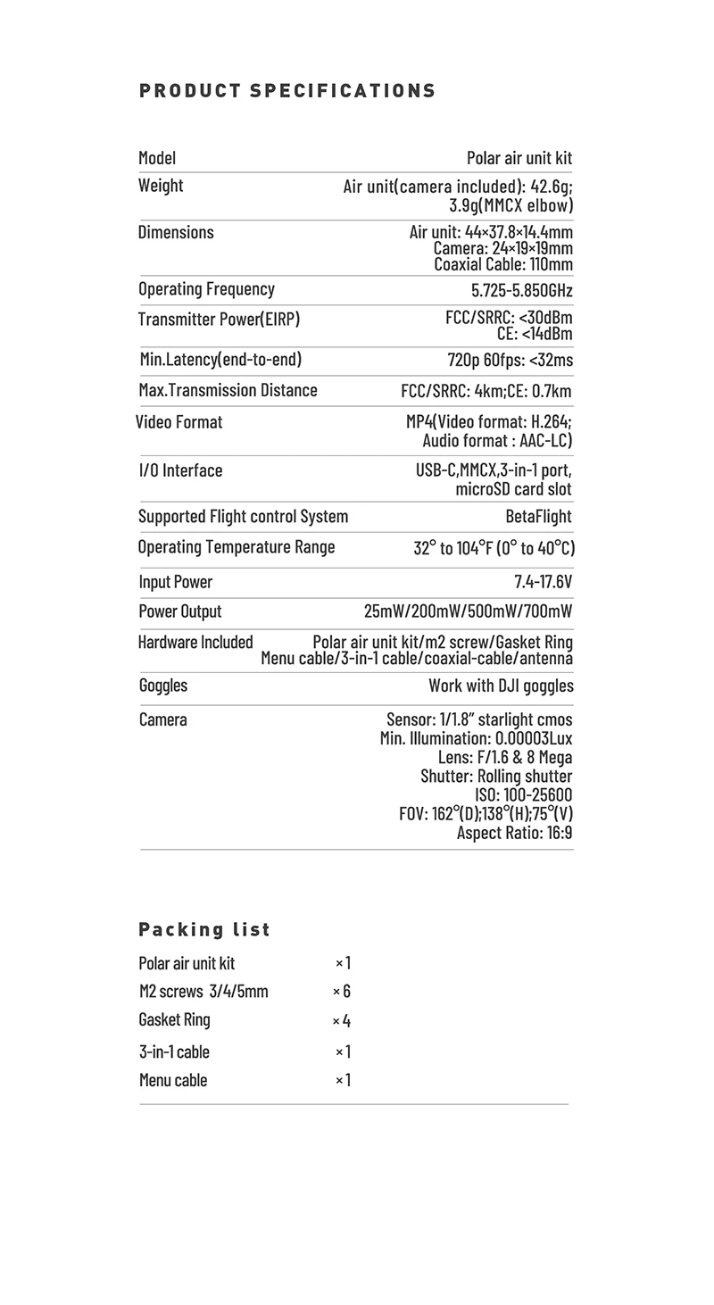 Номер моделиAir Unit Polar starlight Digital HD FPV system