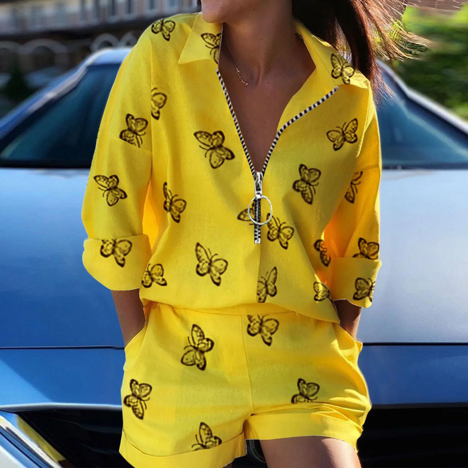 Модный Свободный спортивный костюм с принтом, женская футболка на молнии с длинным рукавом и шорты с карманами, комплекты одежды для лета, женская одежда d4