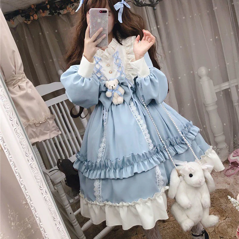 Женское платье в стиле Лолиты, голубое платье принцессы с длинным р...
