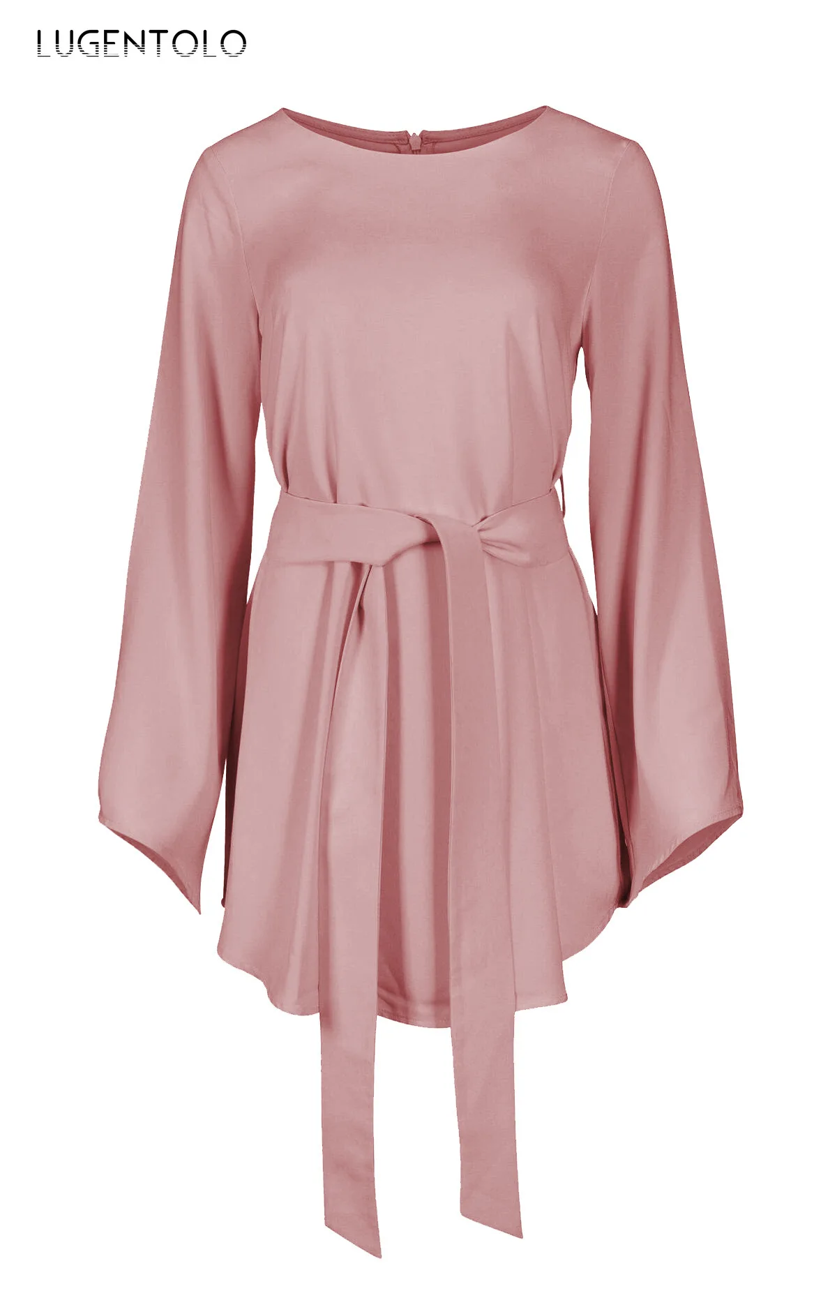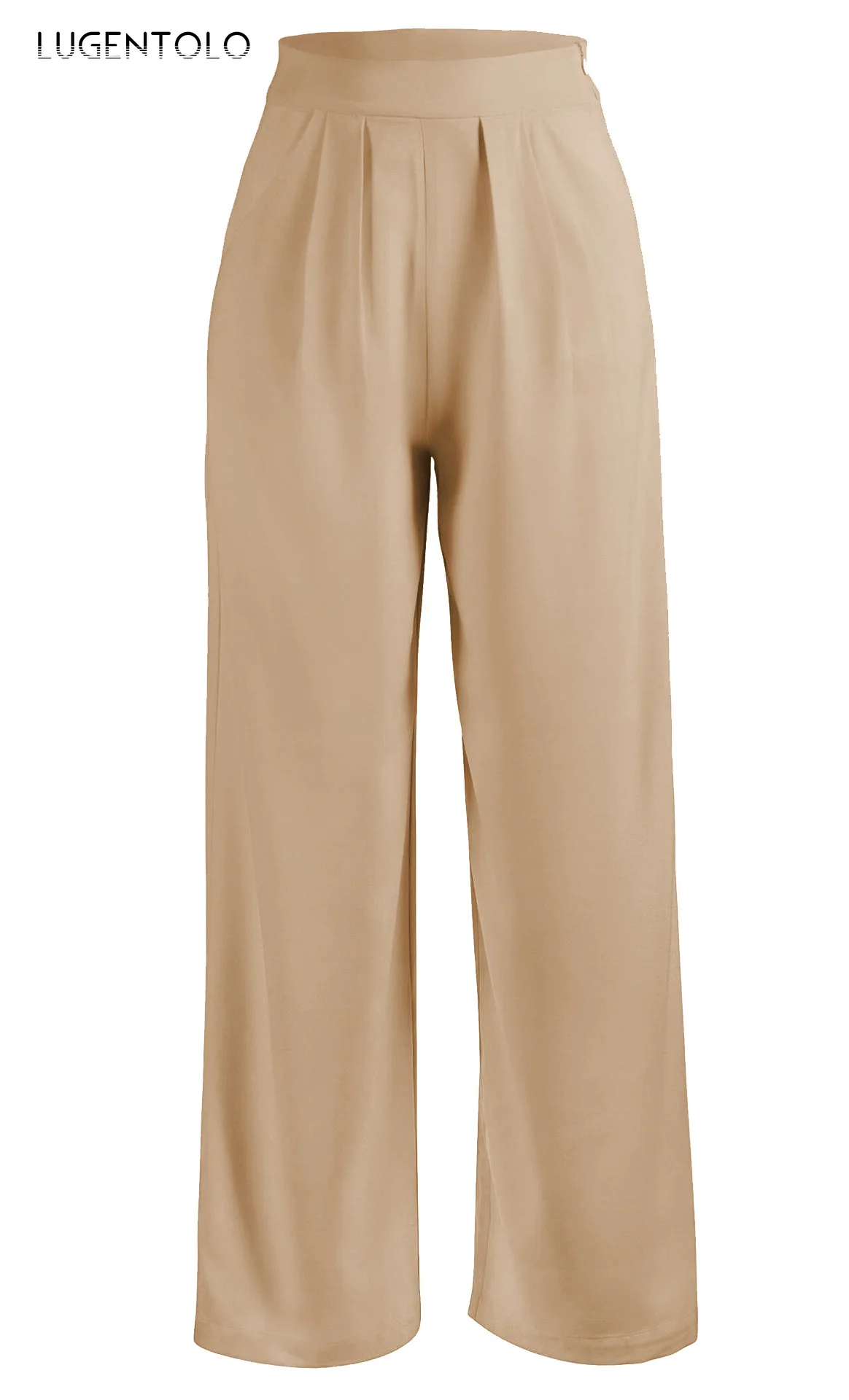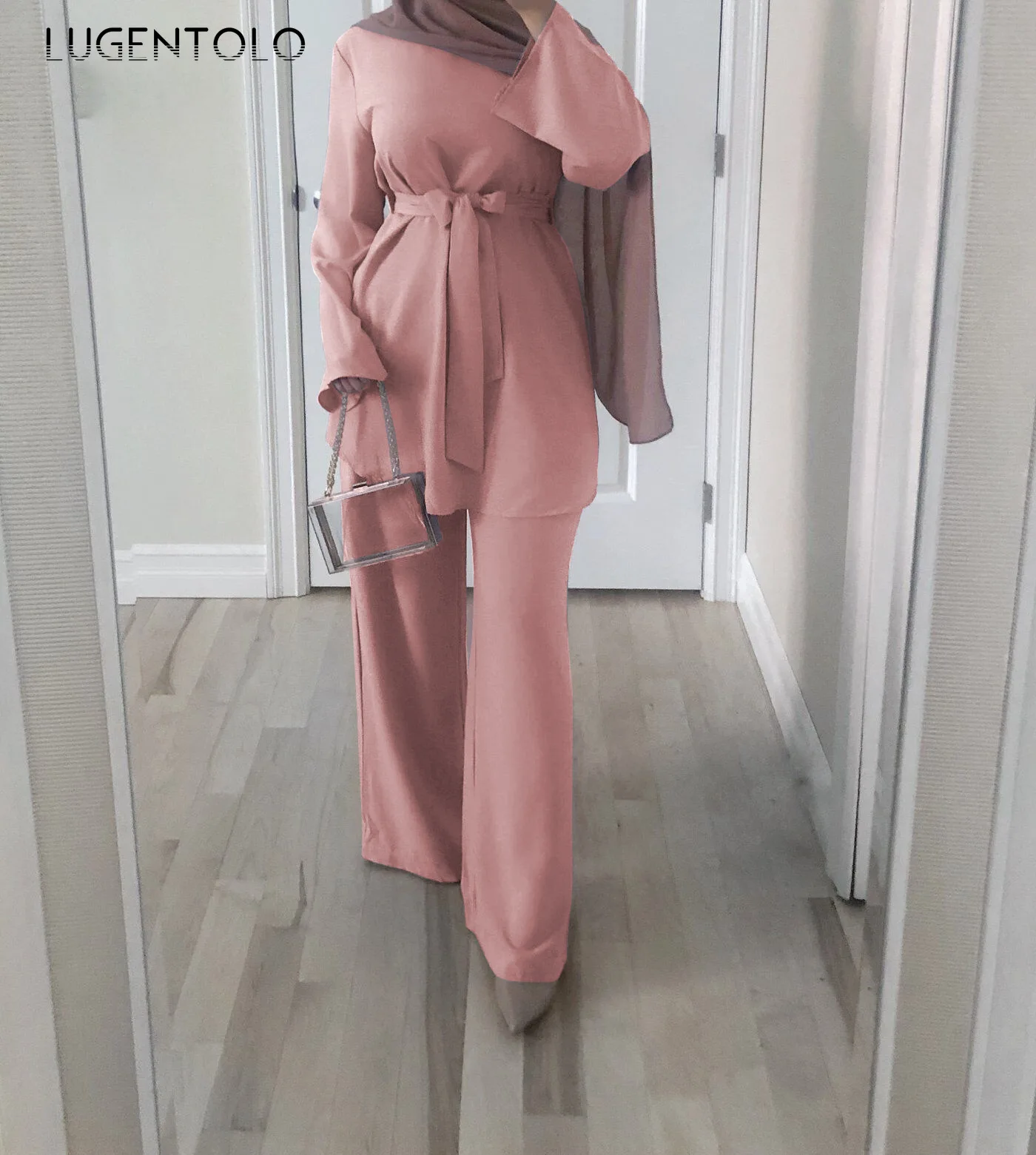 Женский однотонный костюм Lugentolo, со шнуровкой, с длинным рукавом, с круглым вырезом, прямые брюки, элегантный, модный комплект из двух предметов