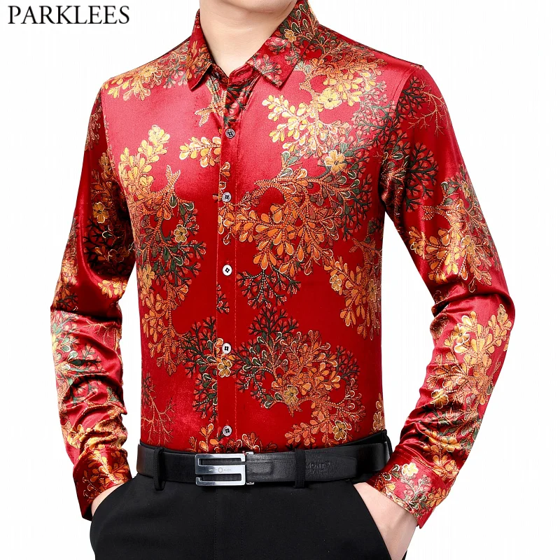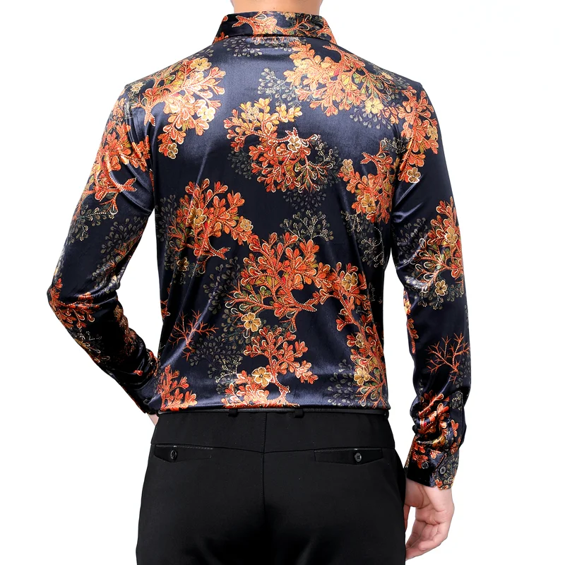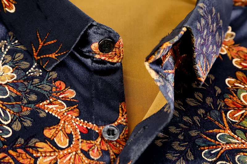 Роскошная мужская Велюровая рубашка с цветочной золотой вышивкой, Новинка осени 2021, приталенная Мужская рубашка с длинным рукавом, Повседневная бархатная рубашка