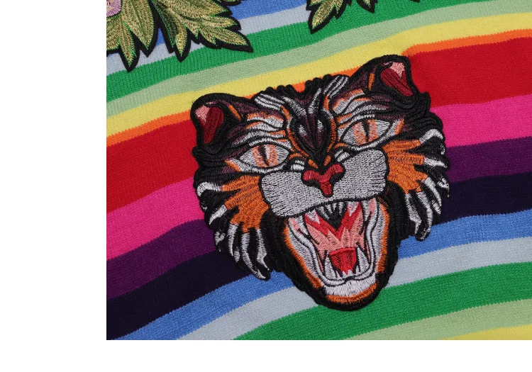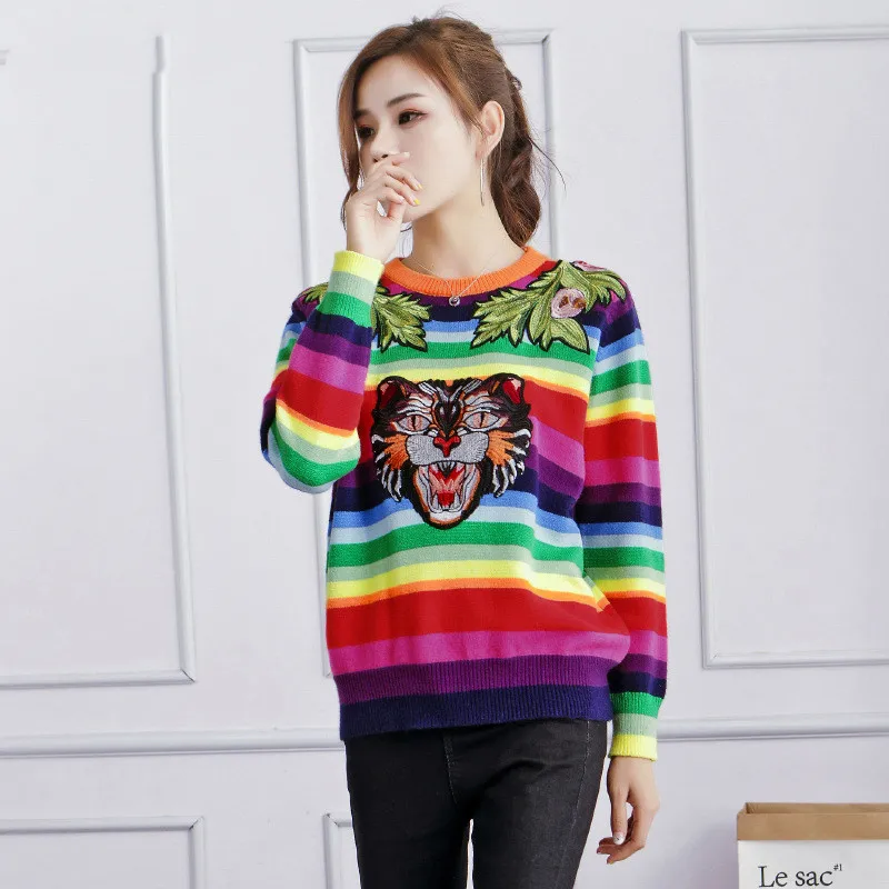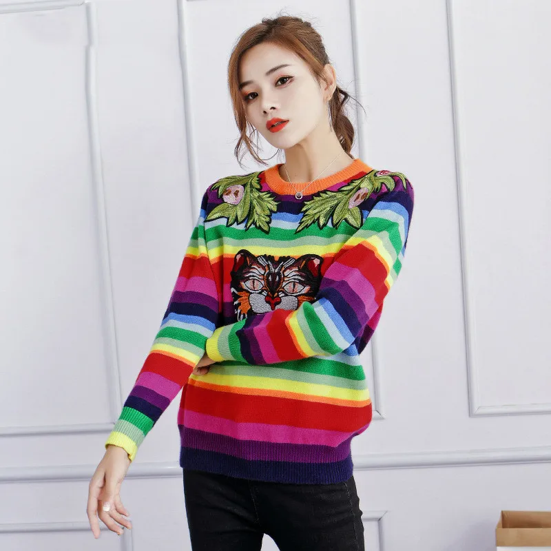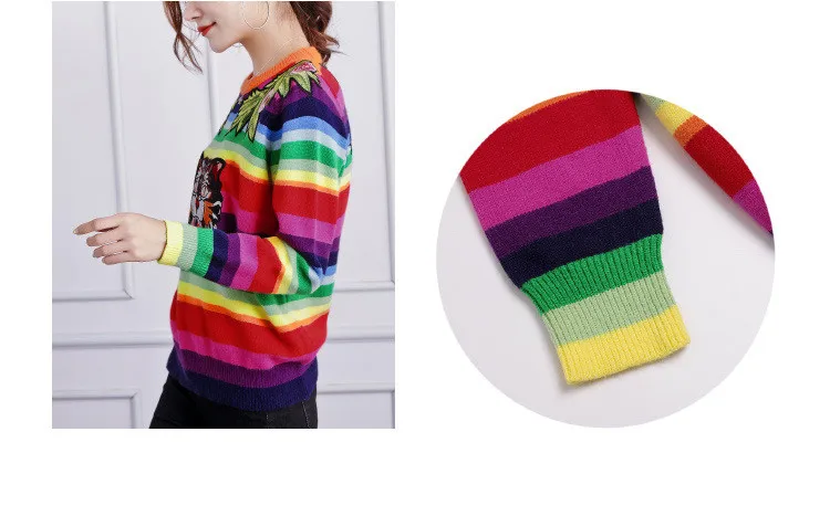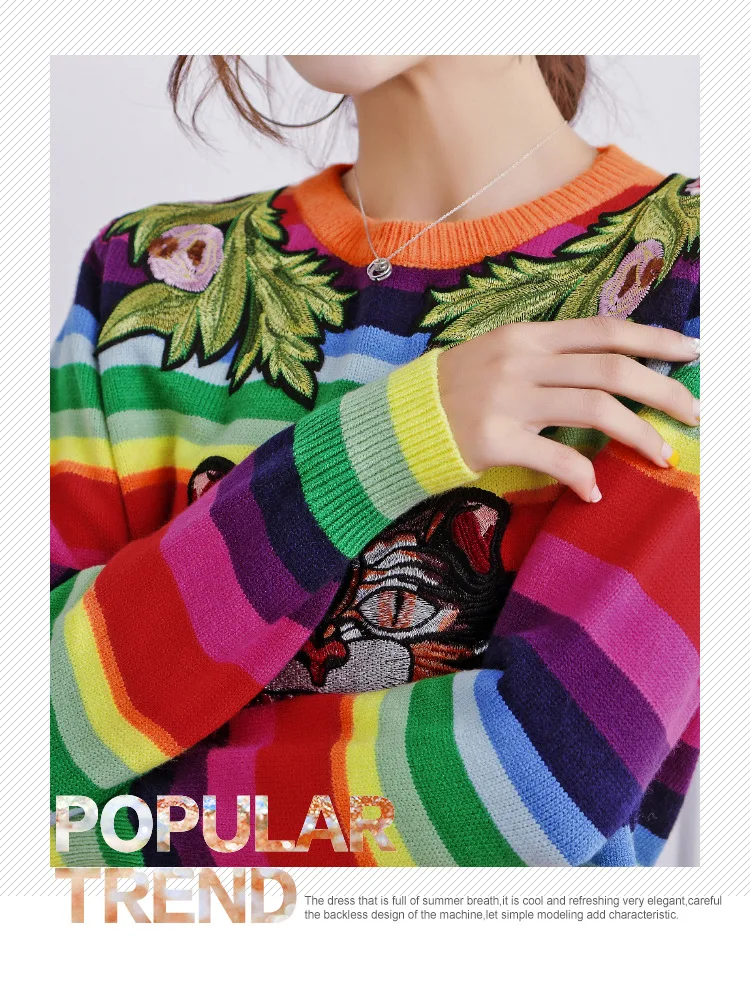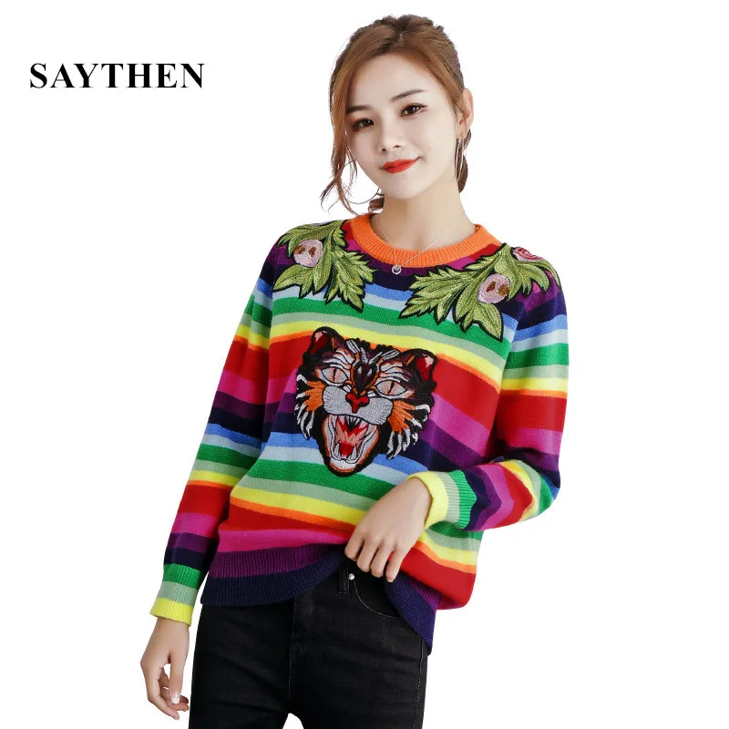 Женские полосатые пуловеры SAYTHEN с радужными полосками и цветочной вышивкой, шерстяные вязаные свитера с буквами, женские топы