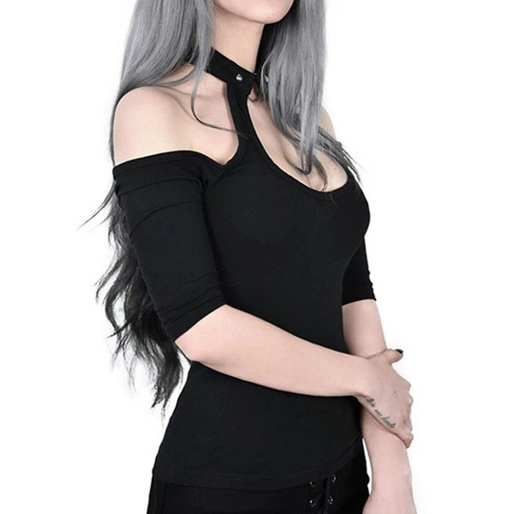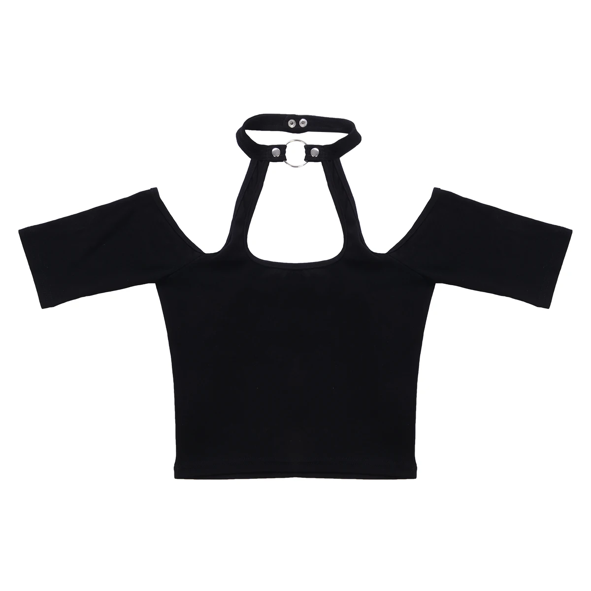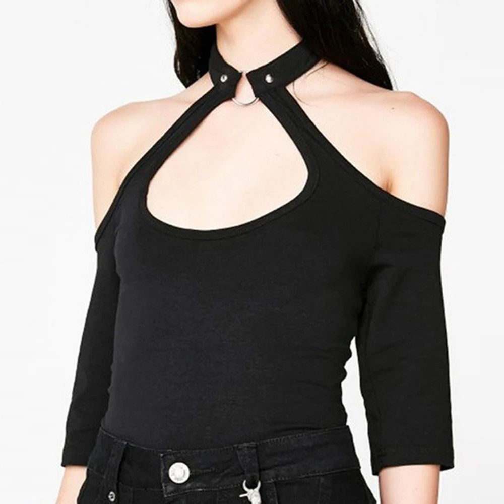 Футболка женская готическая с открытыми плечами, модный топ в стиле панк с лямкой на шее и цепочкой, облегающая Клубная одежда для вечерние, с открытой спиной