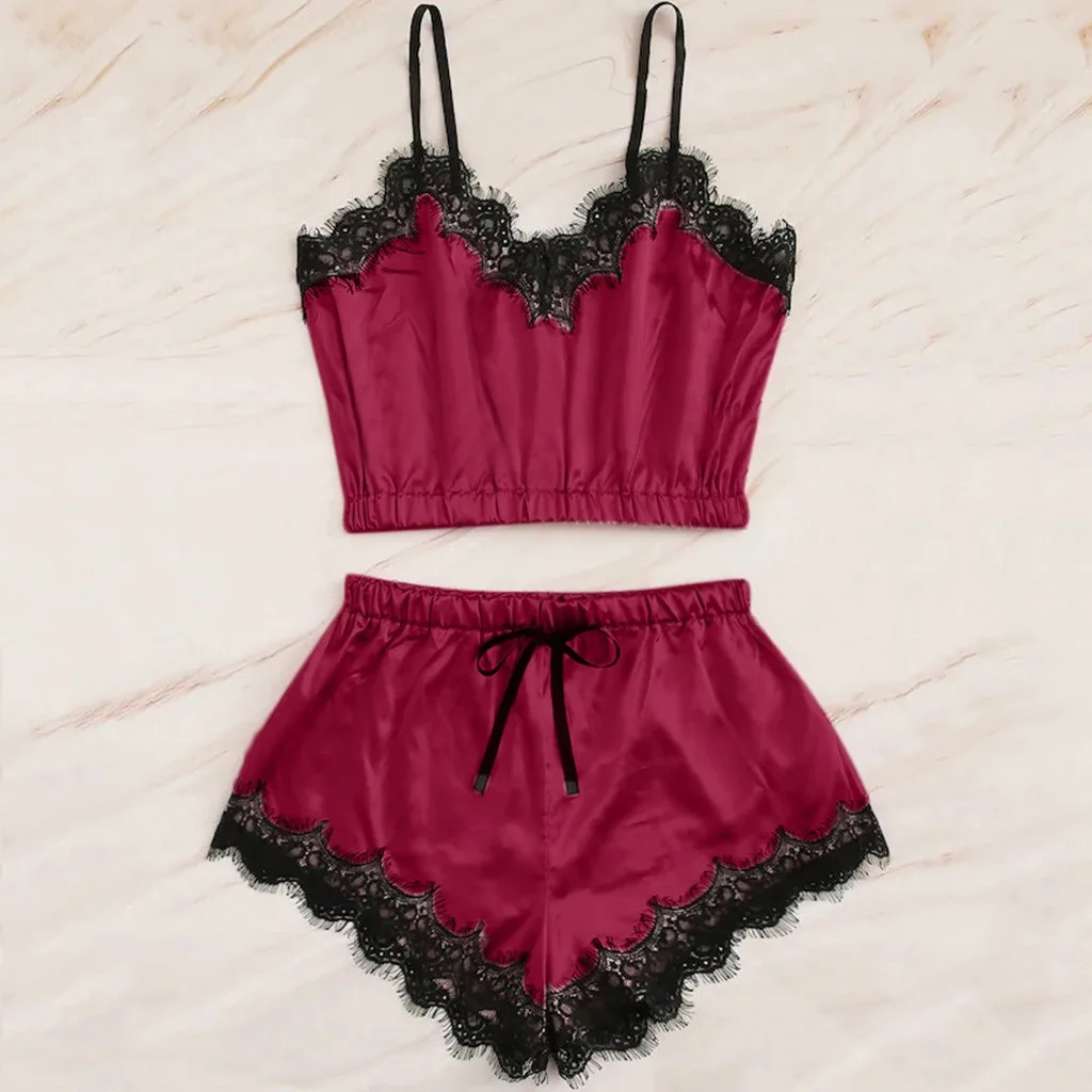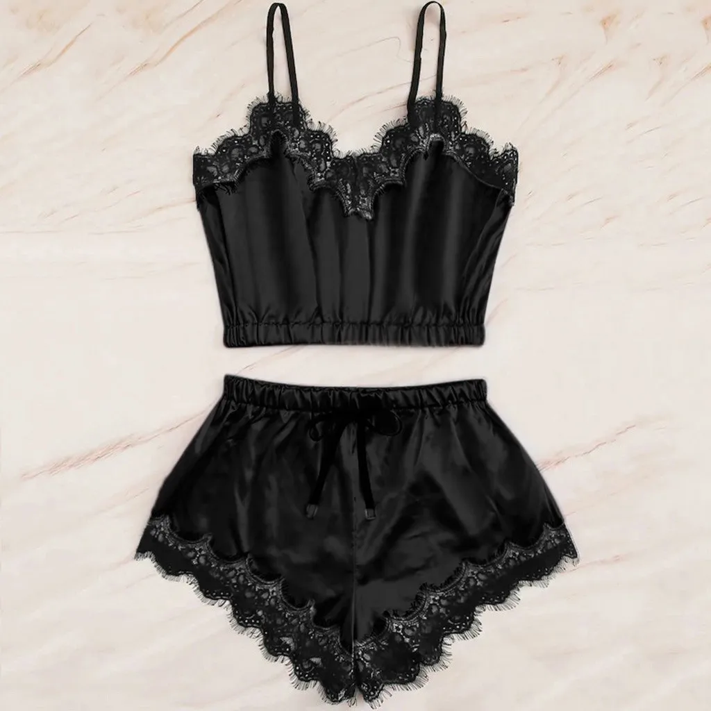 Пижама женская кружевная однотонная с V-образным вырезом и шортами