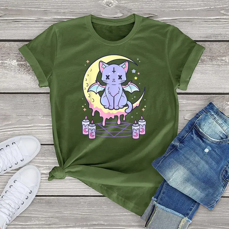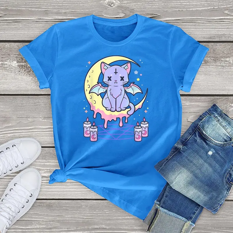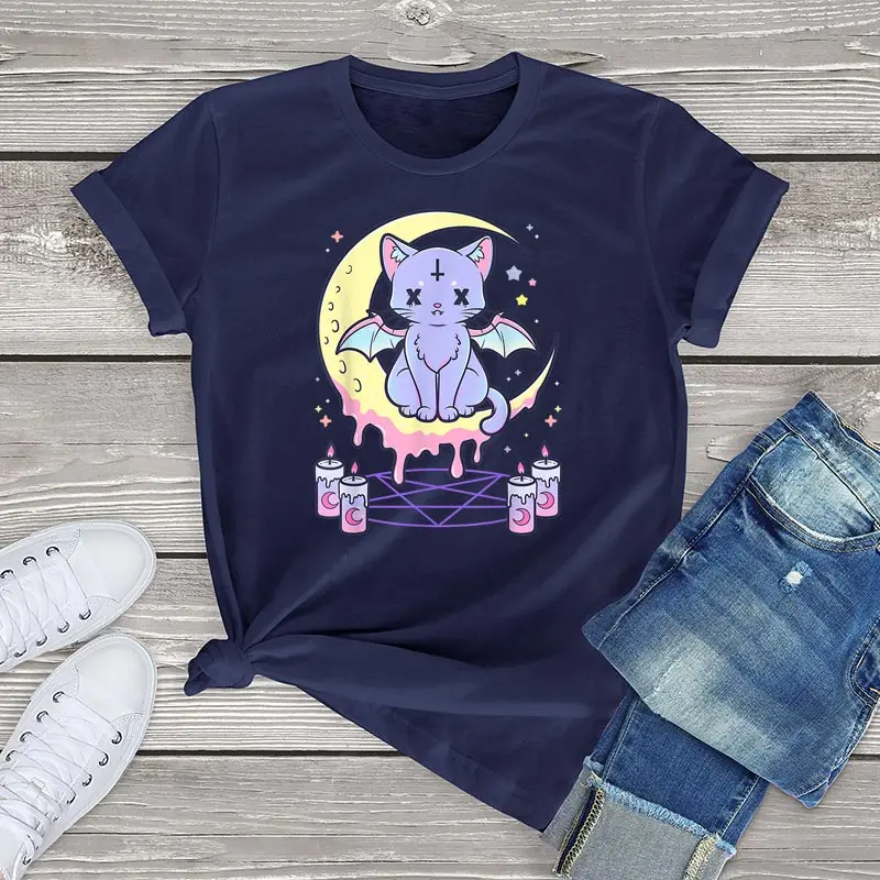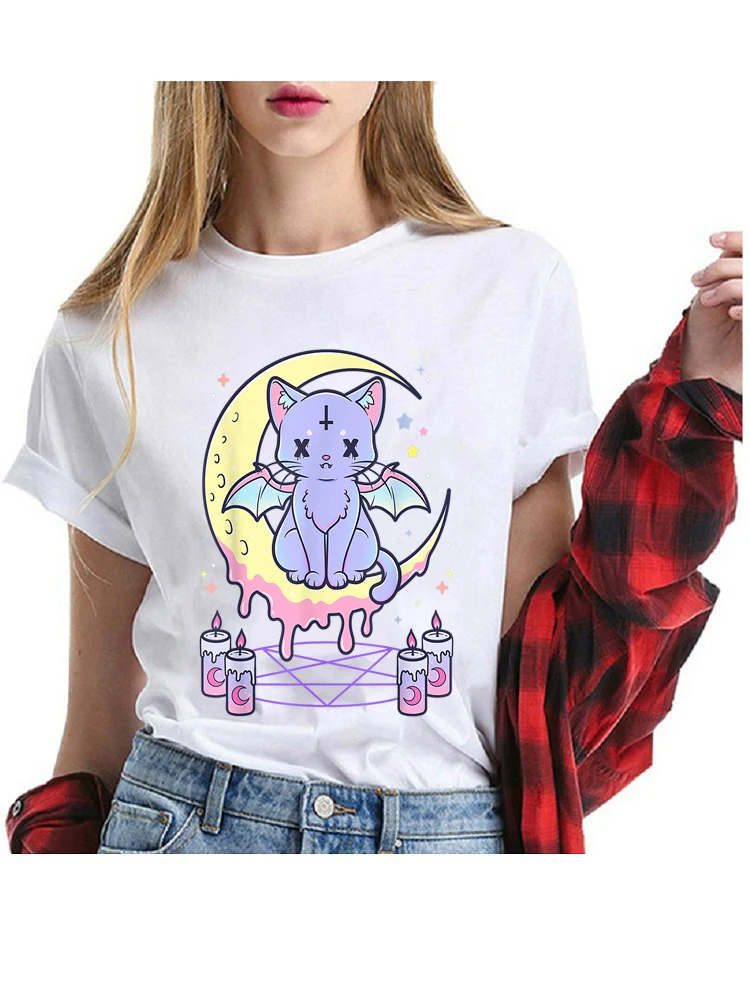 Kawaii Pastel Goth Футболка женская одежда 100 хлопок милый жуткий Черный кот Harajuku женская рубашка Питти унисекс модная футболка Топ