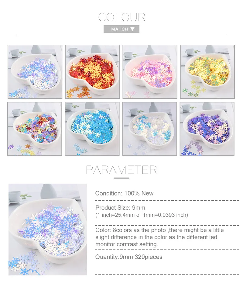 Пайетки для поделок, 9 мм, 320 шт., красочные милые аксессуары для маникюра со снежинками, блестки, фотоматериал