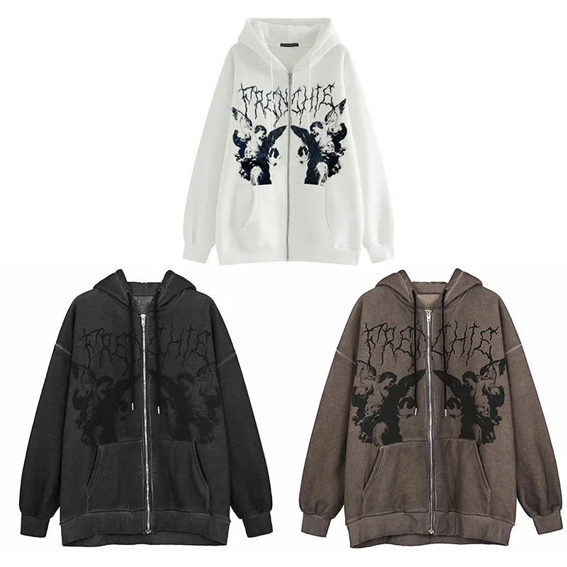 Готический стиль, женские толстовки, винтажные, с принтом ангела, большие толстовки на молнии, с длинным рукавом, Женская толстовка, Y2K гранж, уличная одежда