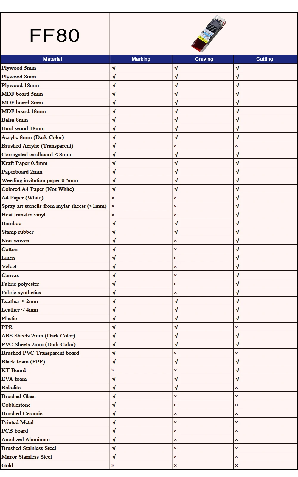 Можно разрезать: МДФ/балса/бумага/дерево/ткань/пластик/кожа/Фанера/пенная бумага.